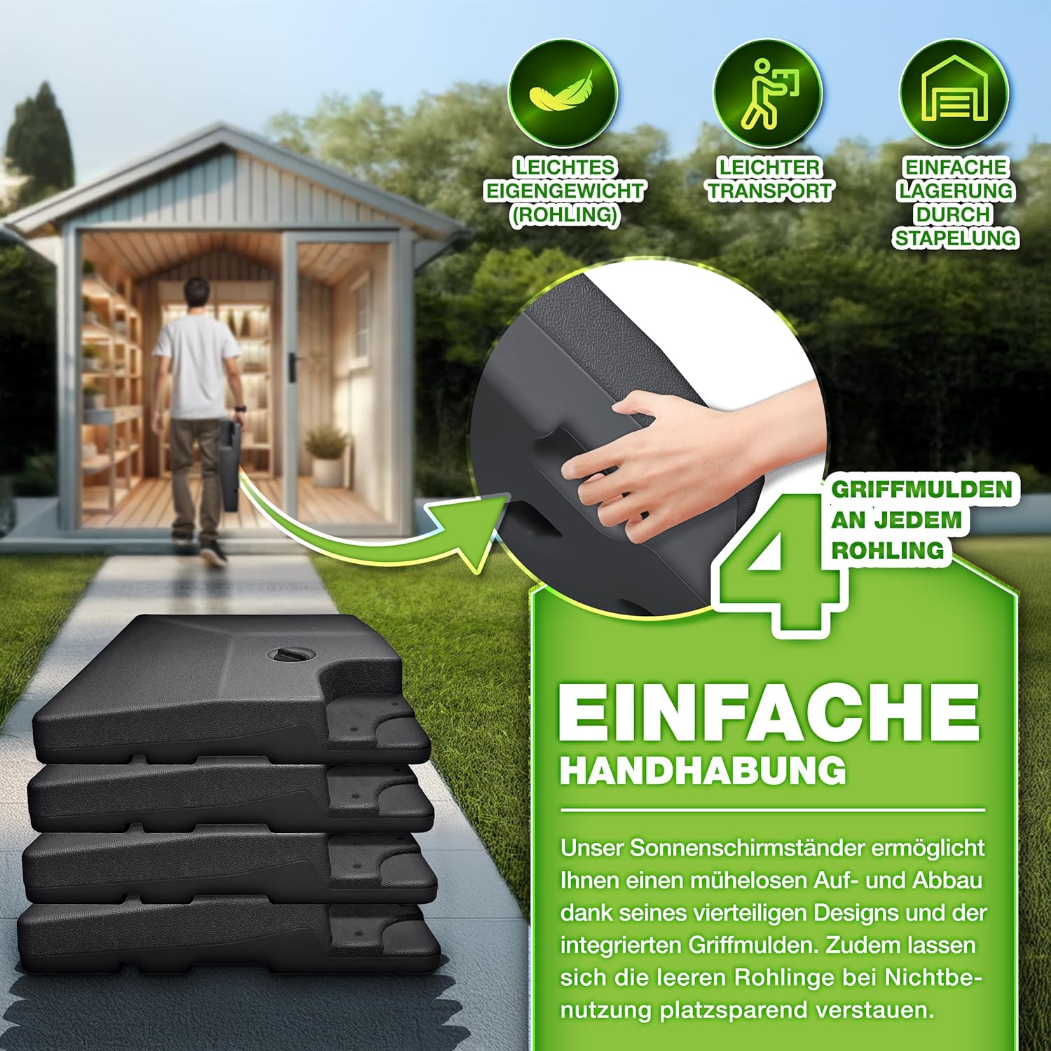 COMPACT ONTWERP: het doordachte, ruimtebesparende ontwerp van de standaard zorgt ervoor dat hij gemakkelijk kan worden opgeborgen wanneer hij niet wordt gebruikt. De vier modulaire parasolgewichten kunnen eenvoudig op elkaar worden gestapeld om ruimte te besparen. Met de ergonomische handgrepen kunnen de bodemplaten ook bij volledige vulling moeiteloos worden verplaatst, perfect voor gebruik op balkon, terras of in de tuin.