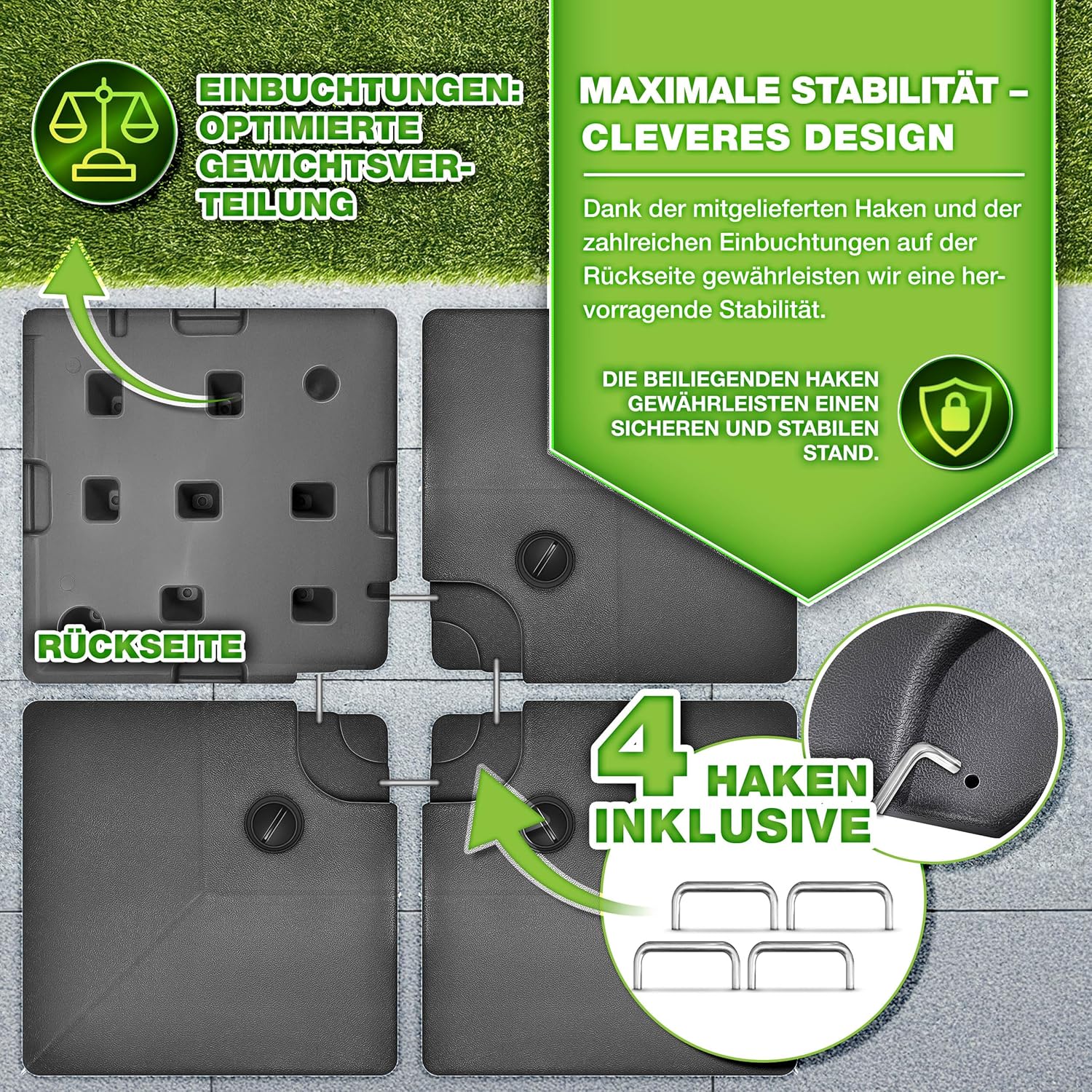 Stabiele grip bij wind en weer: door het doordachte ontwerp met speciaal geplaatste uitsparingen voor een gelijkmatige gewichtsverdeling blijft de parasolvoet zelfs bij sterke wind stabiel. Vier meegeleverde ankers bieden extra veiligheid en voorkomen dat de balkonparasolstandaard omvalt. Deze parasolstandaard is bijzonder geschikt voor windgevoelige gebieden of grotere oppervlakken, zoals terrassen en tuinen.
