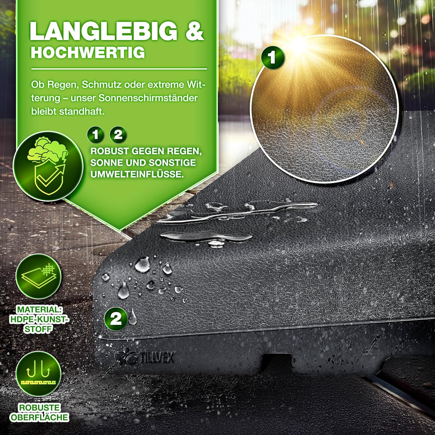 Veelzijdige vullingen: de tillvex kunststof parasolstandaard kan met 90 liter water of 120 kg zand worden gevuld, wat een uitstekende stabiliteit biedt. Deze flexibele vulopties maken een aanpassing van de stabiliteit aan verschillende weersomstandigheden en parasolmaten mogelijk. Of het nu bij lichte wind of stormachtige omstandigheden is, deze parasolhouder houdt je parasol altijd veilig op zijn plaats.