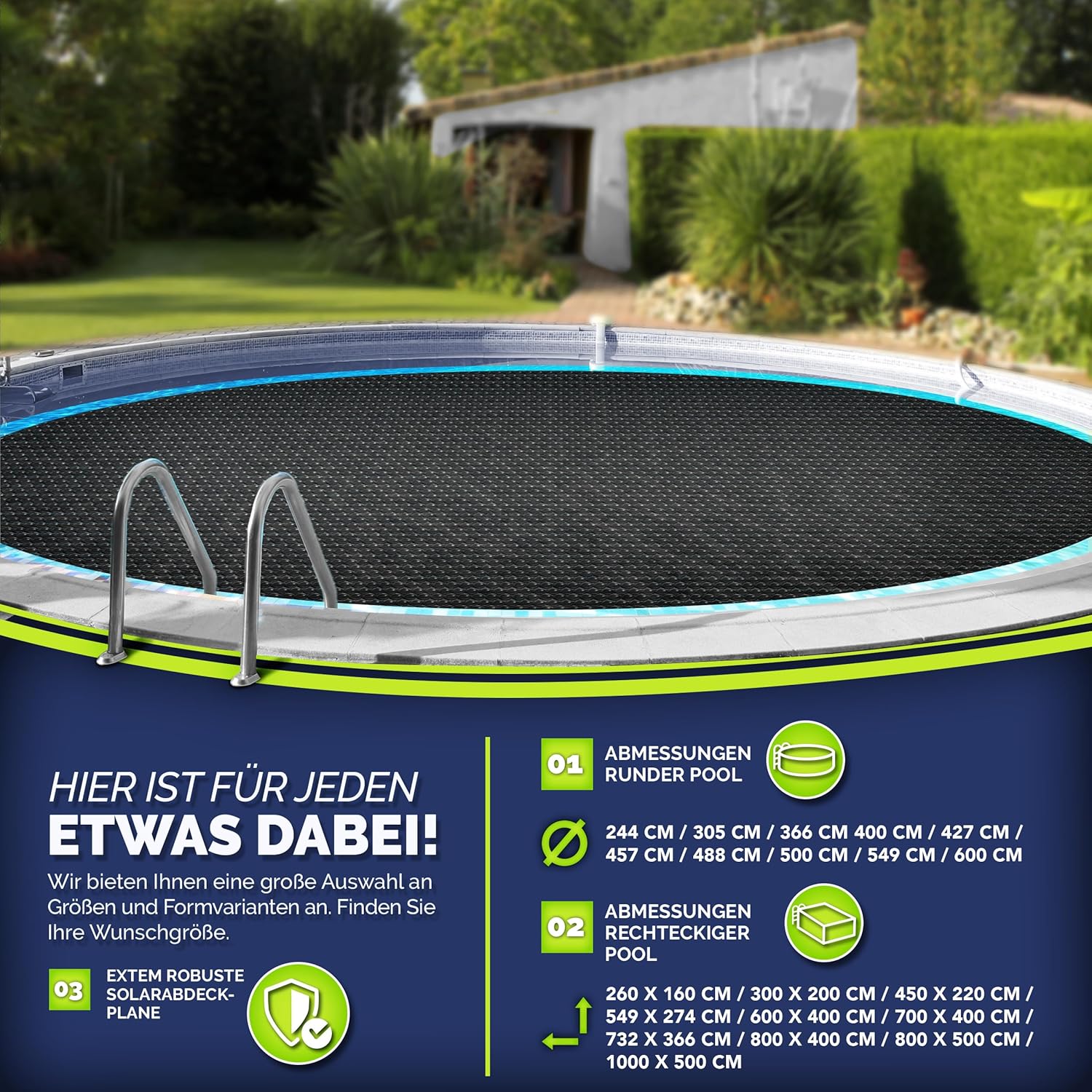 • MILIEUVRIENDELIJK VERWARMEN: hoogwaardige zwembadzonnefolie voor milieuvriendelijk en zuinig opwarmen van het water door zonne-energie. De besparing op verwarmingskosten bedraagt 70 procent.