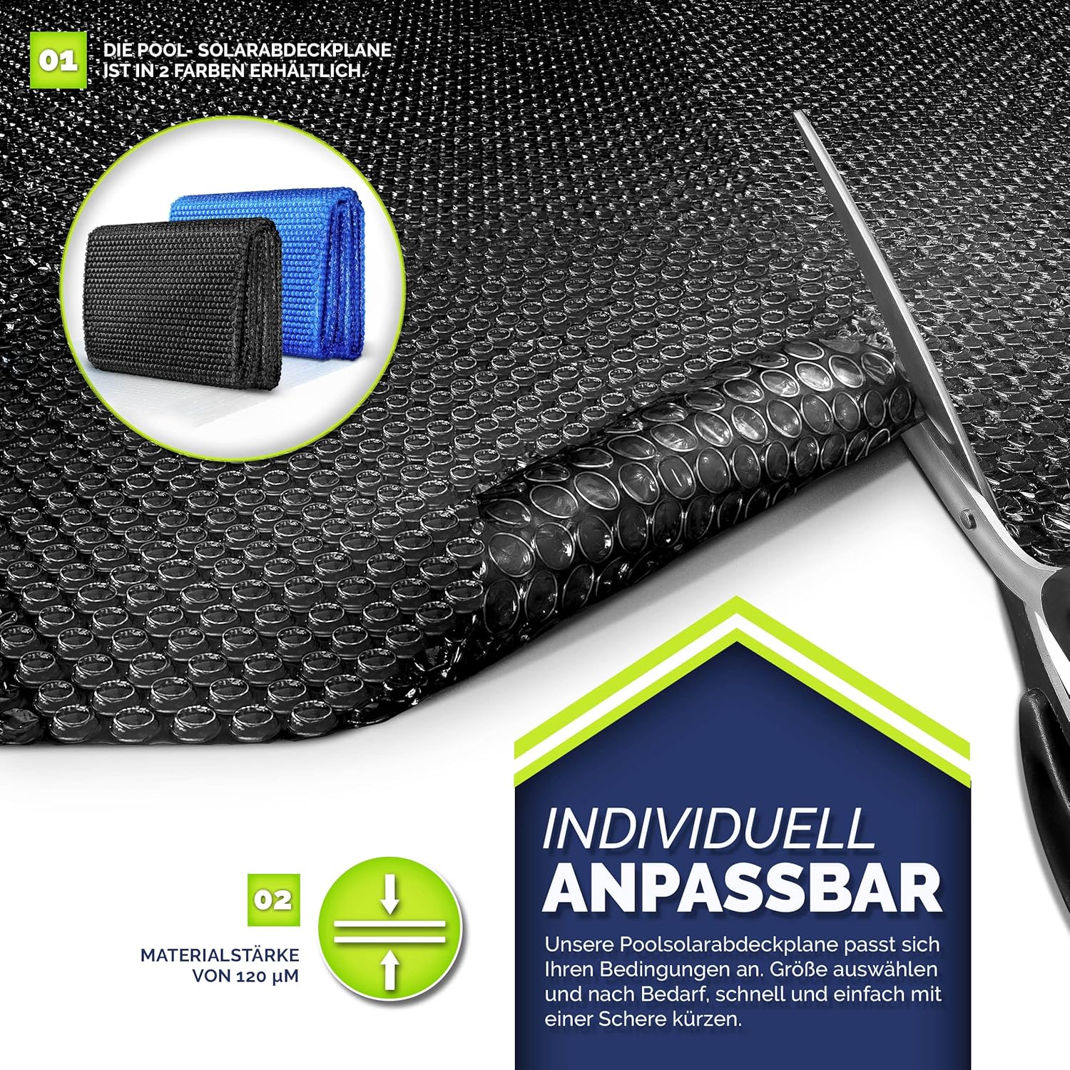 • Hoogwaardige materialen: door het PE-luchtkussen en de materiaaldikte van 120 µm wordt de in het zwembad opgeslagen warmte opgezet, zodat 's nachts slechts een klein warmteverlies ontstaat.