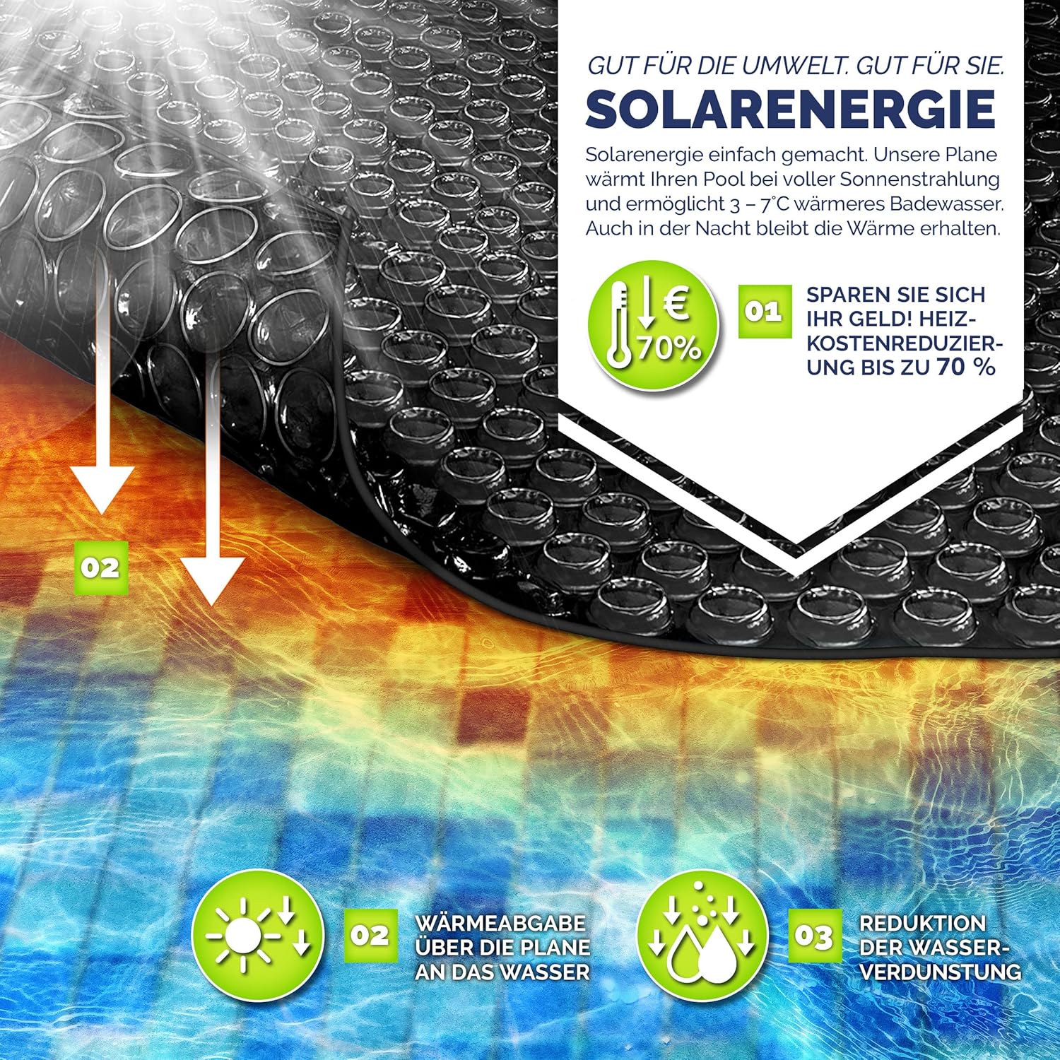 • MILIEUVRIENDELIJK VERWARMEN: hoogwaardige zwembadzonnefolie voor milieuvriendelijk en zuinig opwarmen van het water door zonne-energie. De besparing op verwarmingskosten bedraagt 70 procent.