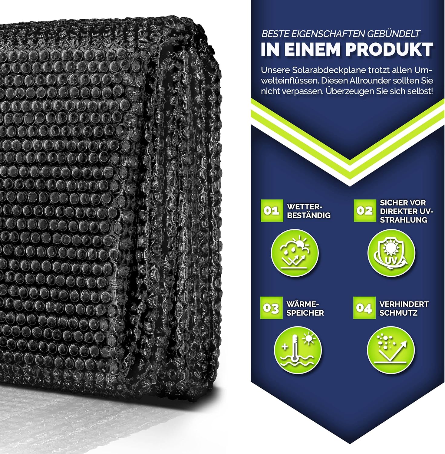 • MILIEUVRIENDELIJK VERWARMEN: hoogwaardige zwembadzonnefolie voor milieuvriendelijk en zuinig opwarmen van het water door zonne-energie. De besparing op verwarmingskosten bedraagt 70 procent.