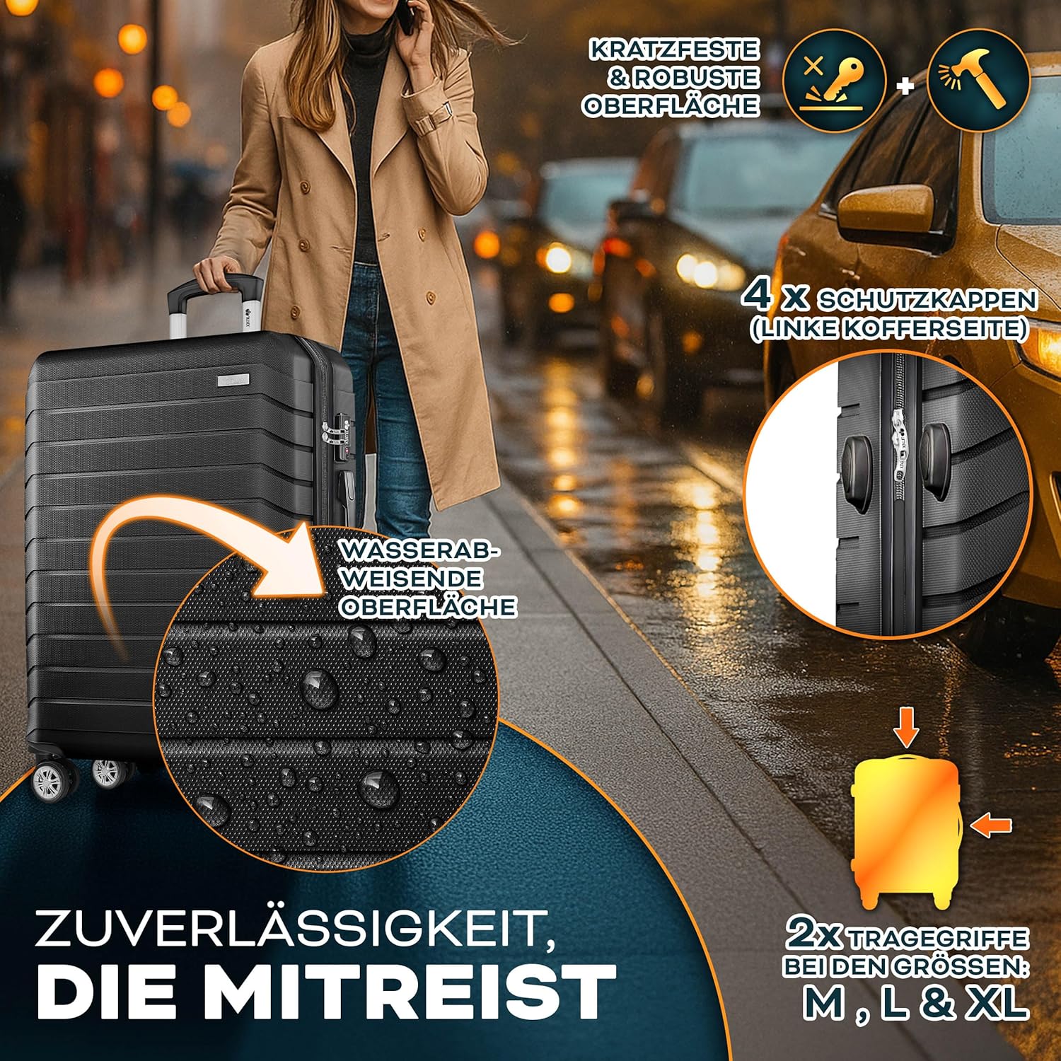 Ruimtebesparende opslag: de hardcase-kofferset met de maten M, L en XL (maat M = handbagage) kan moeiteloos in elkaar worden opgeborgen, waardoor niet alleen opbergruimte wordt gemaximaliseerd, maar ook flexibiliteit voor verschillende reisbehoeften is gegarandeerd. Een praktische bagageset voor je reisplanning.