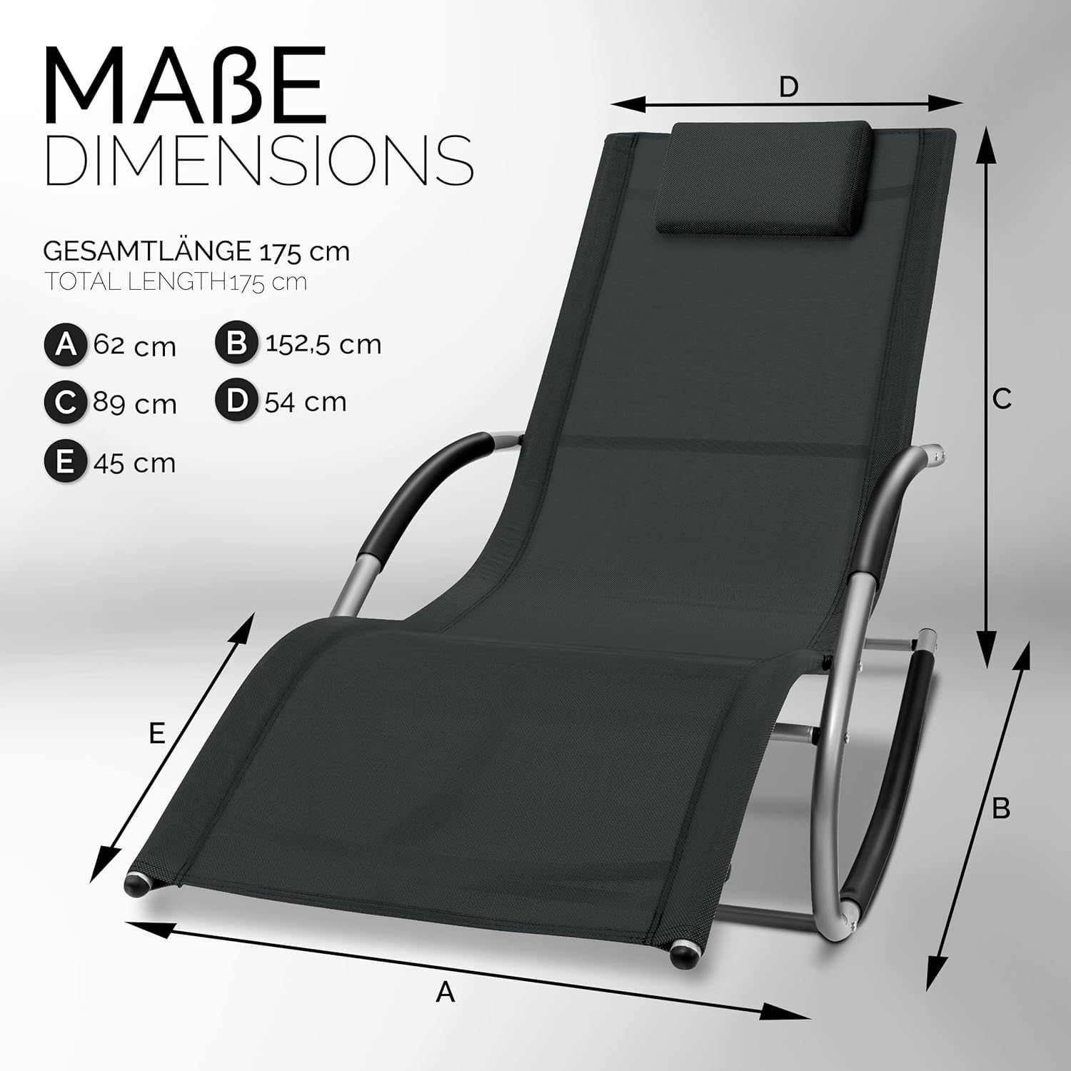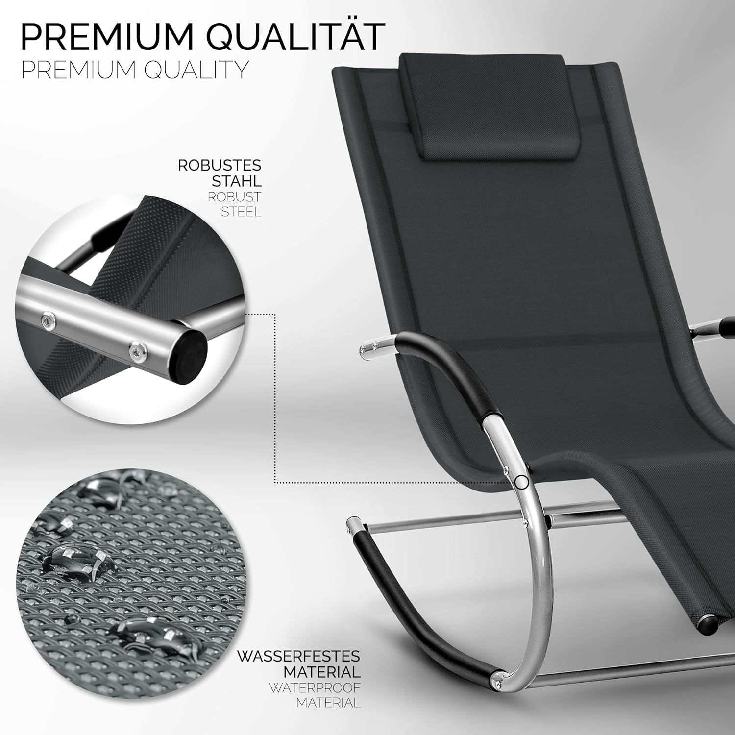 Materiaal: verzinkt stalen frame + textielweefselbelastbaarheid: 150 kg. Afneembaar hoofdkussen, waterdicht, ademend ligvlak, UV-bestendig, zeer onderhoudsvriendelijk, 10 kg, eigen gewicht, opvouwbaar design, ergonomisch gevormde ligstoel