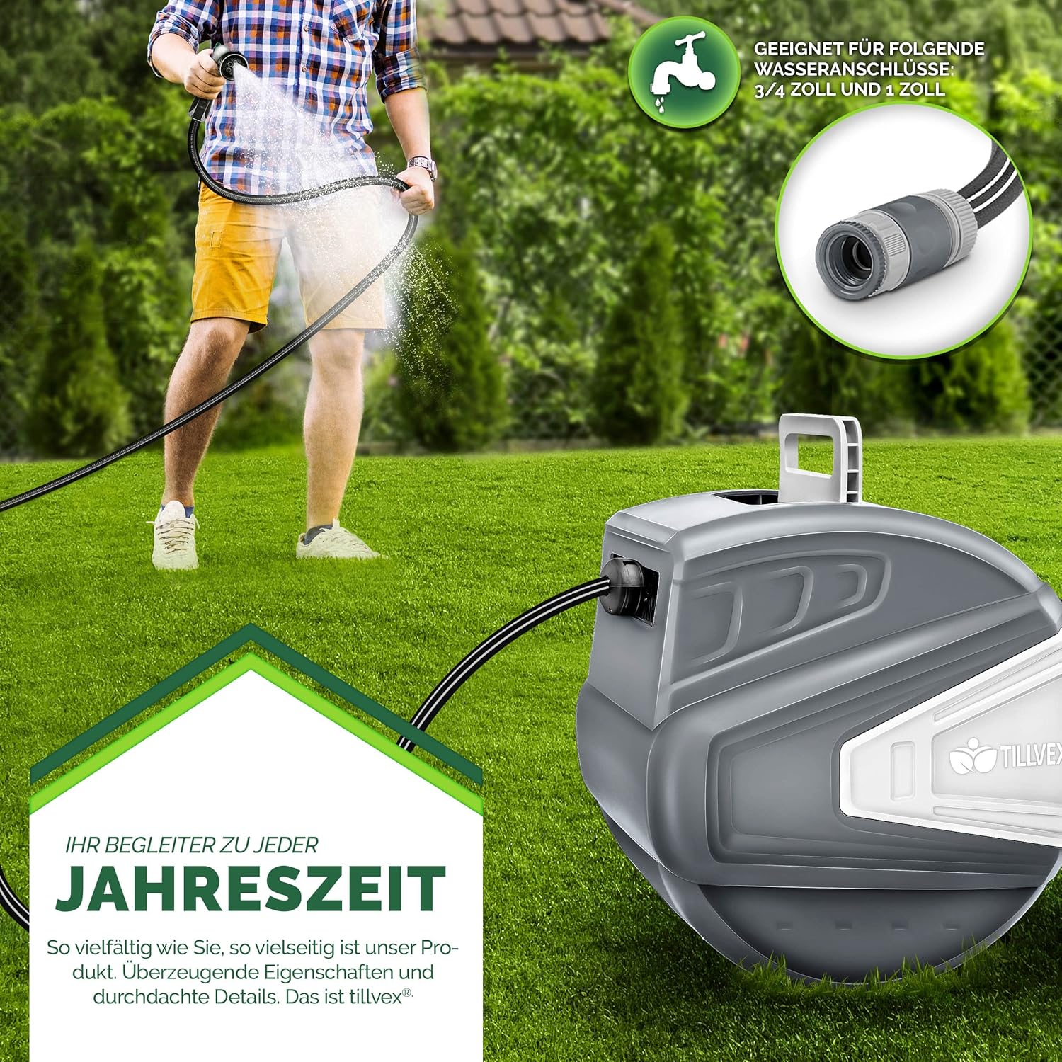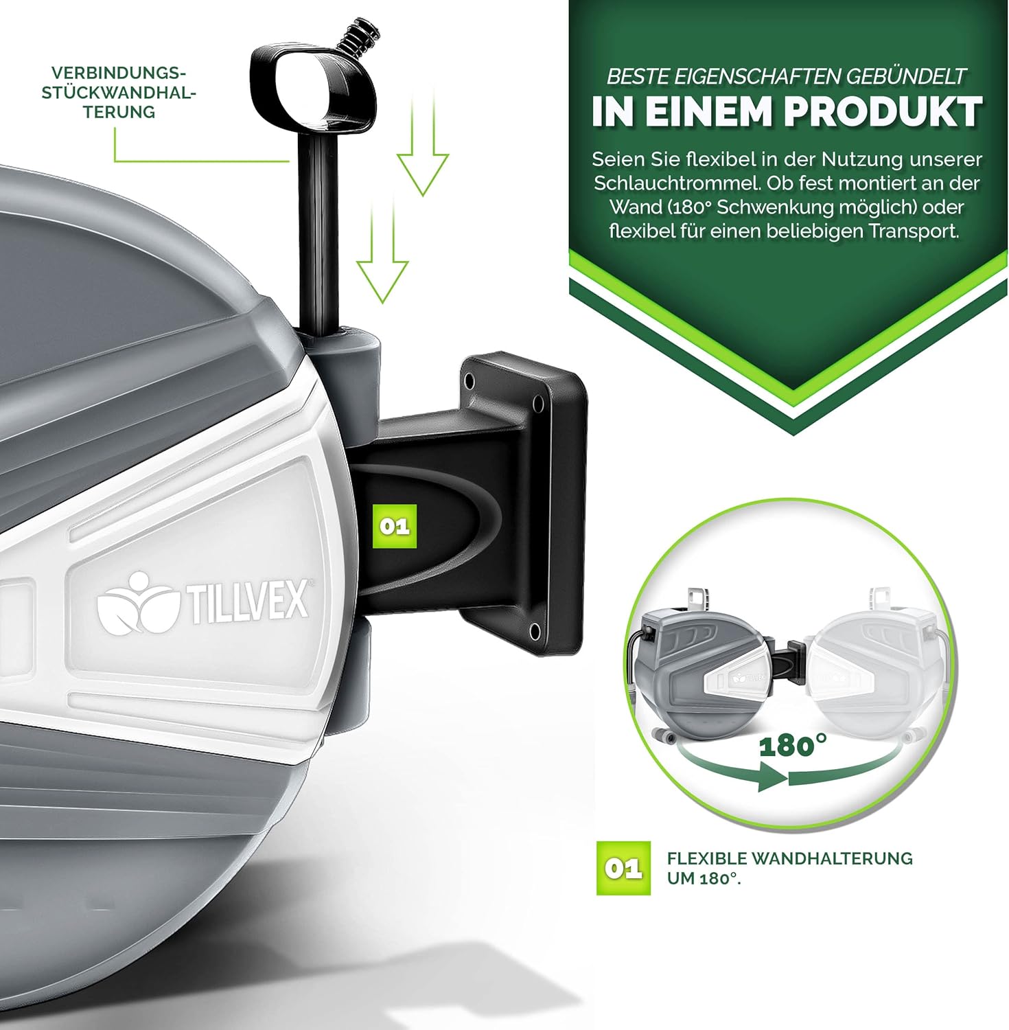 Tillvex slanghaspel met wandhouder + draaggreep, slanghaspel met handdouche en tuinslang, 180 graden draaibaar, wandslangbox met automatisch oprolmechanisme