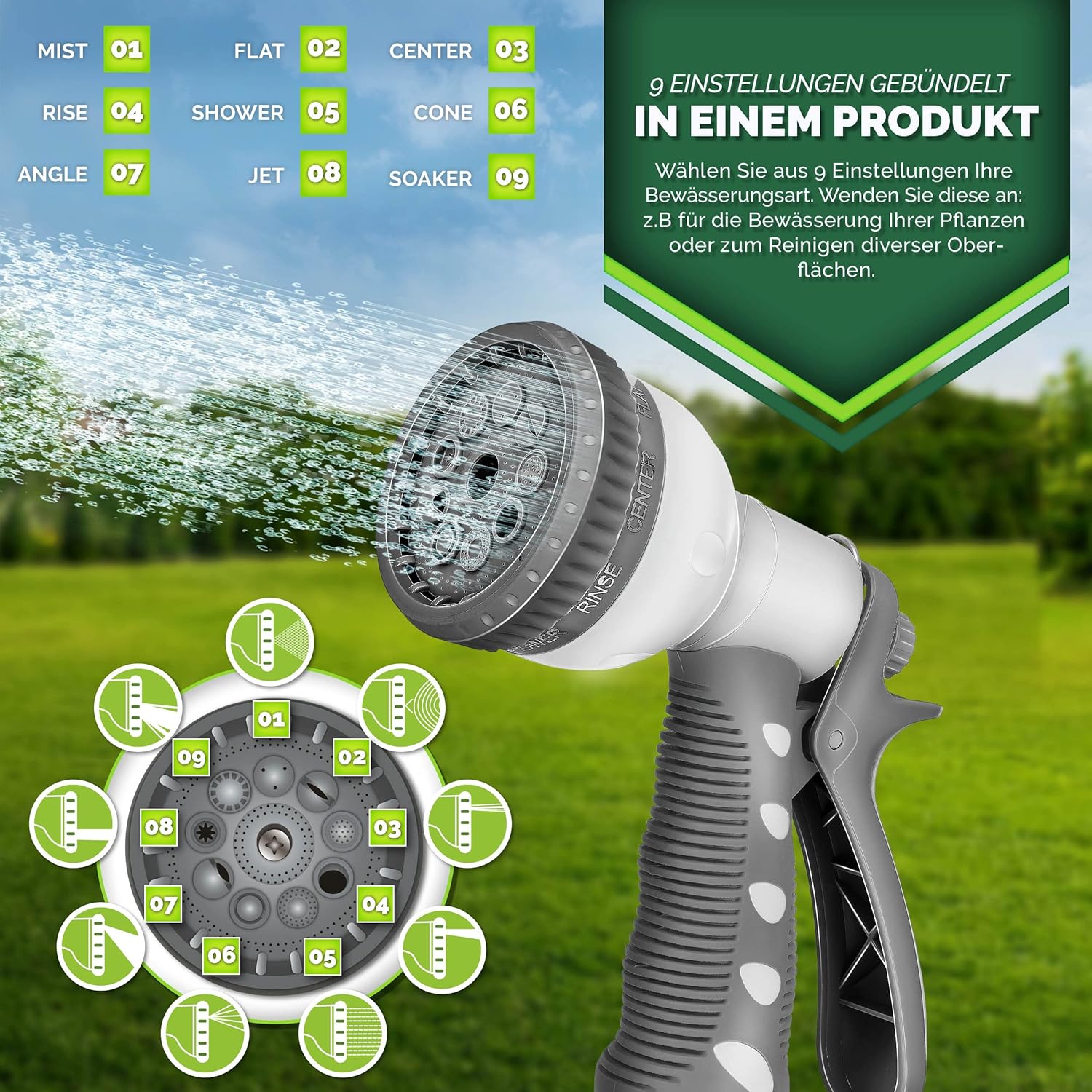 Tuinsproeier met vele functies: de tuinhanddouche van onze slanghaspel heeft in totaal 9 sproeifuncties. Bovendien is er een vergrendelingsfunctie voor de sproeiknop.