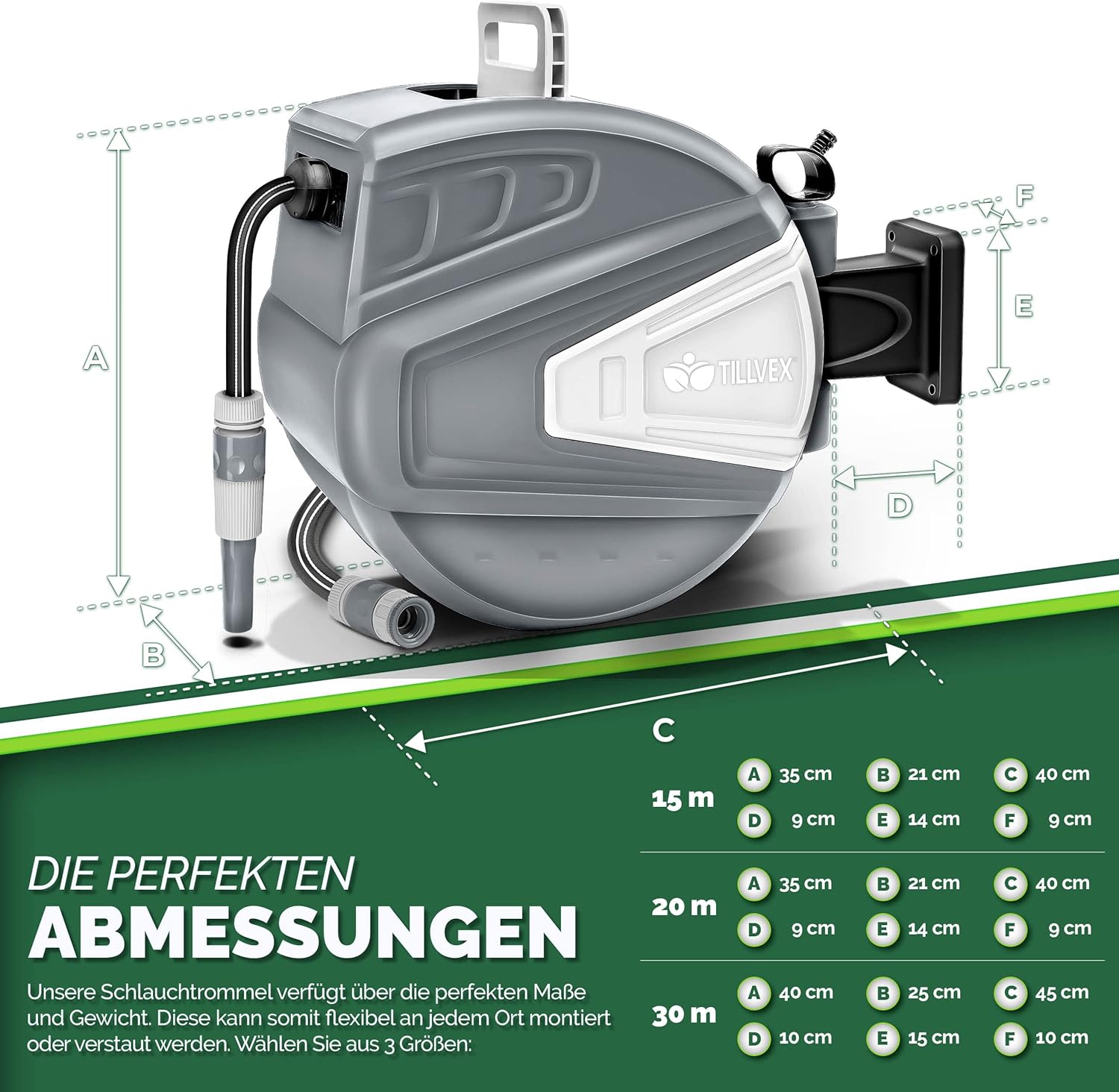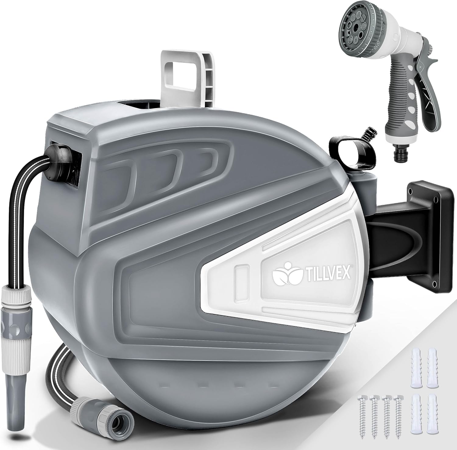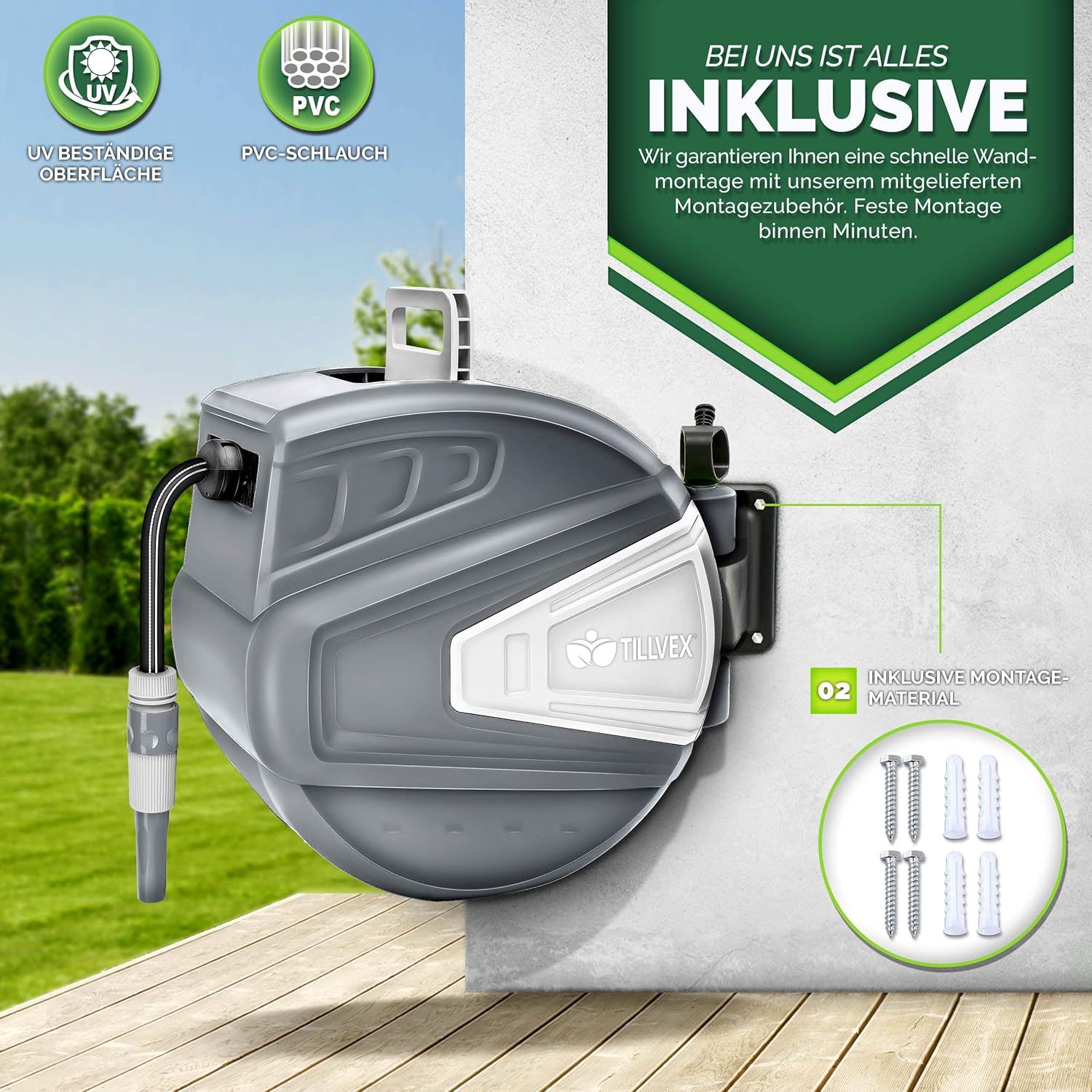 Tillvex slanghaspel met wandhouder + draaggreep, slanghaspel met handdouche en tuinslang, 180 graden draaibaar, wandslangbox met automatisch oprolmechanisme