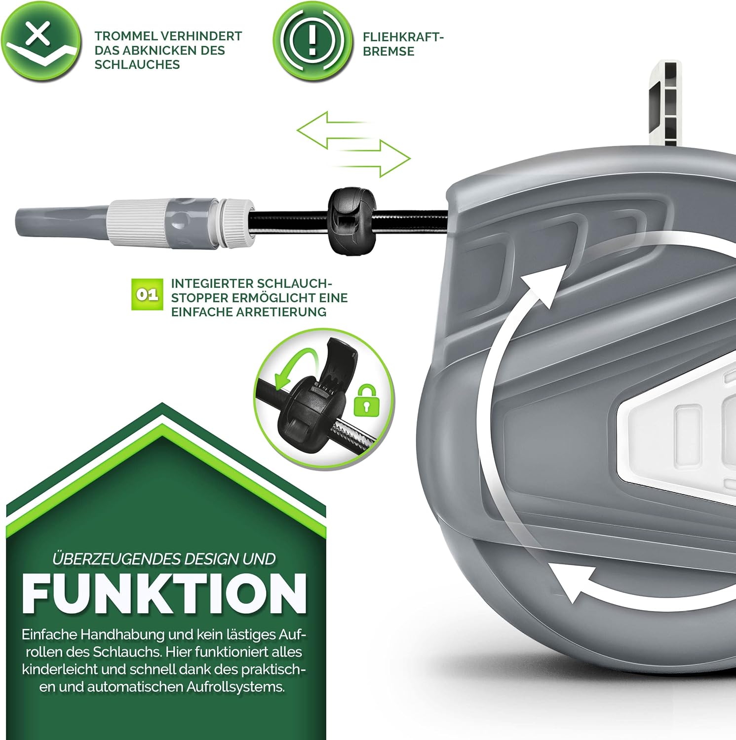 Automatische slanghaspel, afneembare wandhouder, tuinsproeier met 90 sproeifuncties, inclusief Comfortabele draaggreep van 180 graden op de wandhouder, draaibaar, traploos instelbaar, flexibele slangrem en eenvoudig transport, UV-bestendig. Wordt gemonteerd geleverd