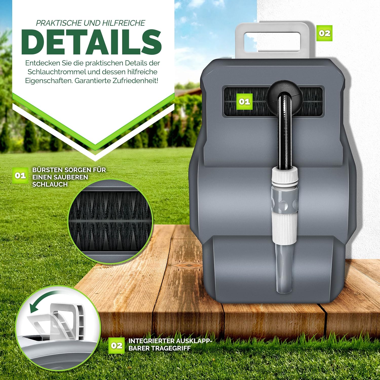 • Veel functies: met automatische oprolfunctie, slanggeleiding en slangstopper voor een perfecte wikkeling. Bovendien bevindt zich aan de binnenkant van de slanghaspel een reinigingsborstel. Inclusief aansluitslang op de kraan of het insteeksysteem van bekende tuinslangfabrikanten.