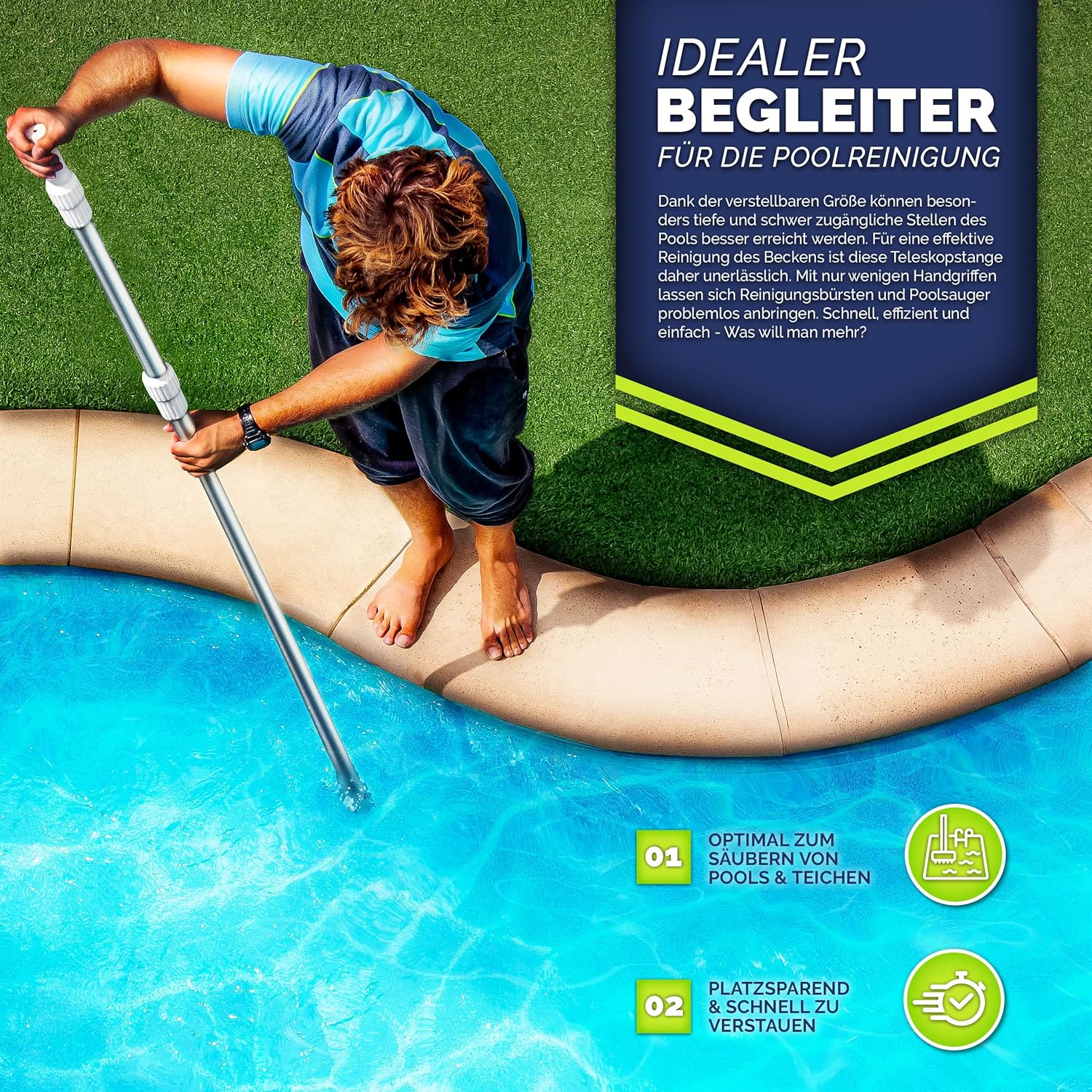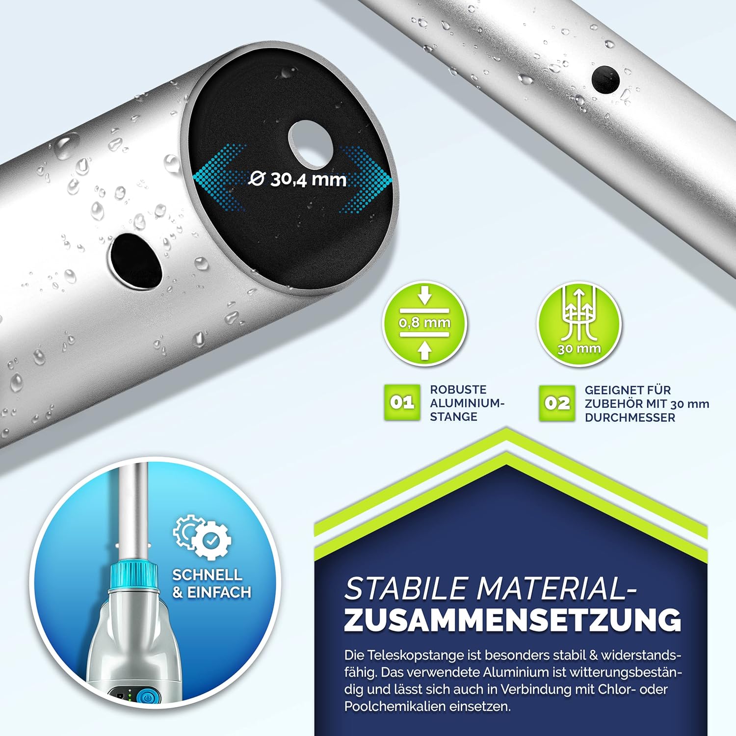 De telescoopstang is bijzonder stabiel en duurzaam. Het gebruikte aluminium is weerbestendig en kan ook bij chloor en zwembadchemicaliën worden gebruikt.