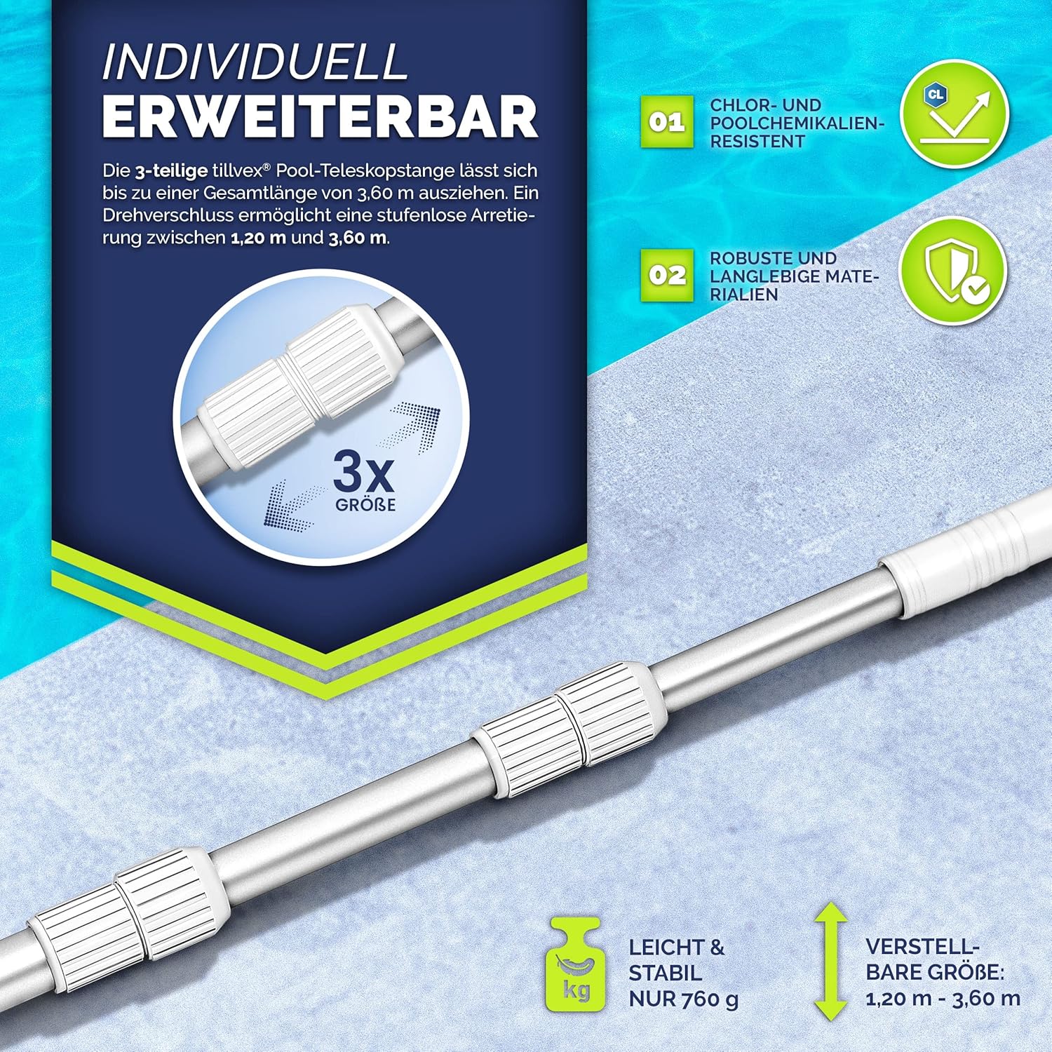 Tillvex Telescoopstang voor zwembad, 1,20 of 3,60 m, aluminium zwembadstang, stang voor zwembadreiniging, 3-delig