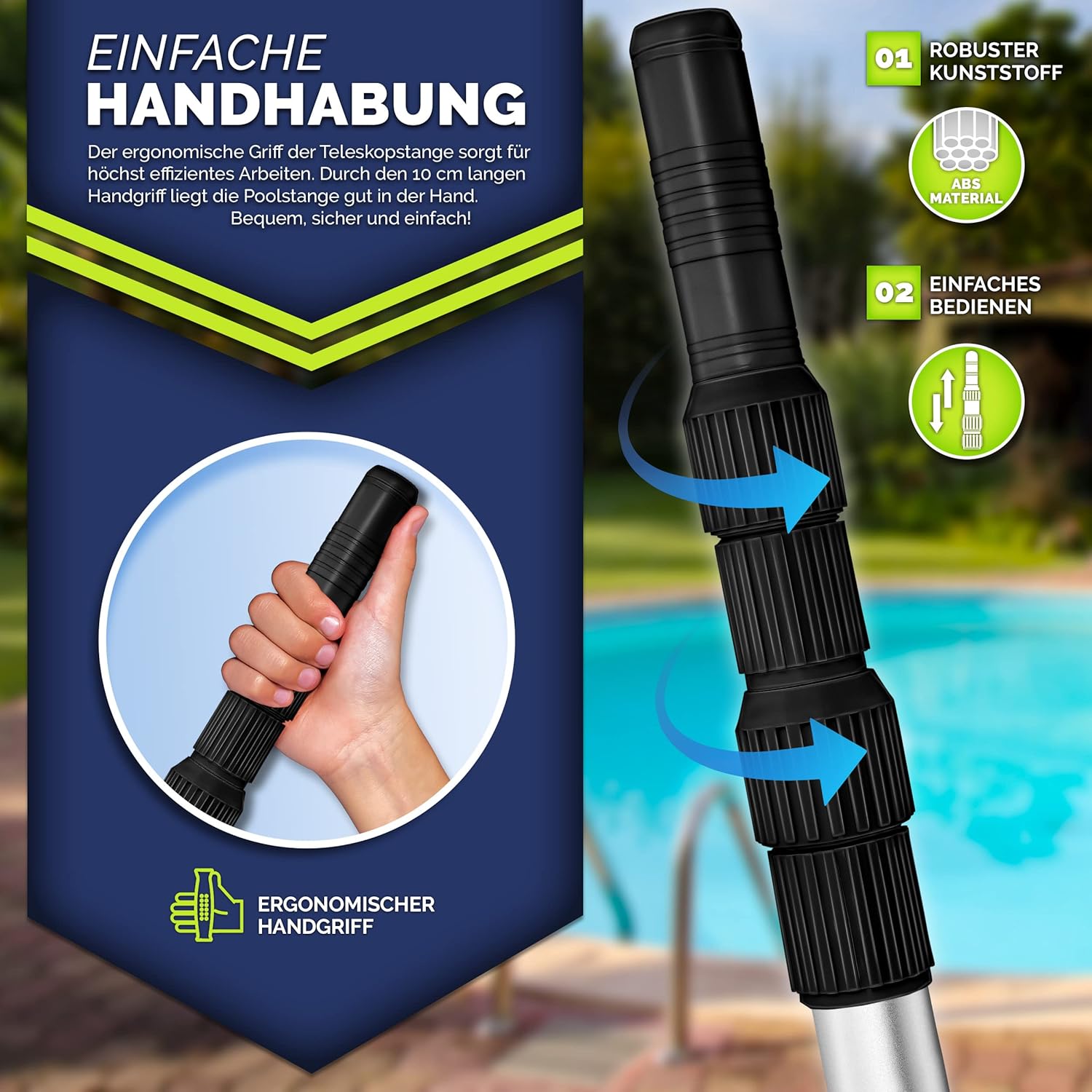 Door de ergonomisch gevormde handgreep van ABS-kunststof ligt de zwembadstang goed in de hand. De lengte wordt ingesteld door middel van een draaimechanisme.