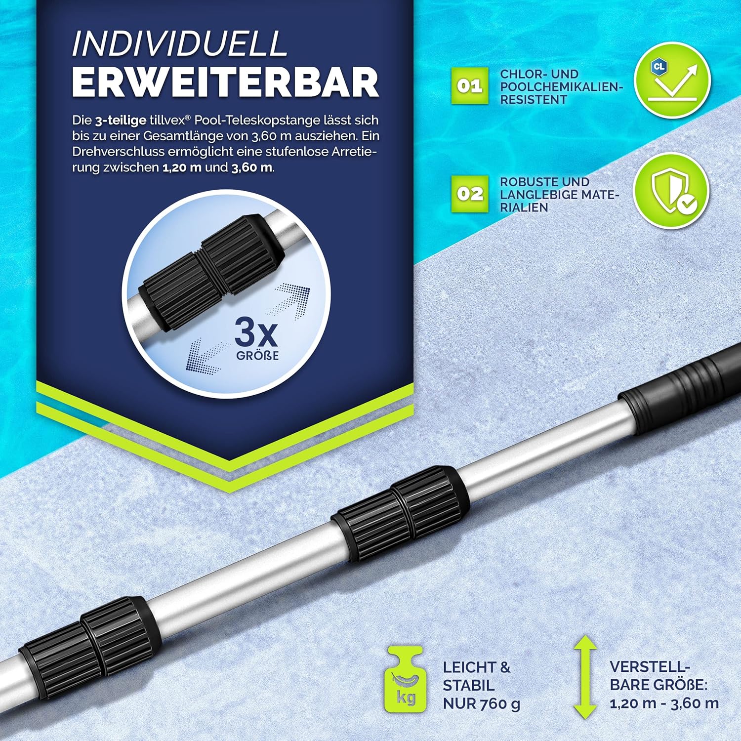 Tillvex Telescoopstang voor zwembad, 1,20 of 3,60 m, aluminium zwembadstang, stang voor zwembadreiniging, 3-delig
