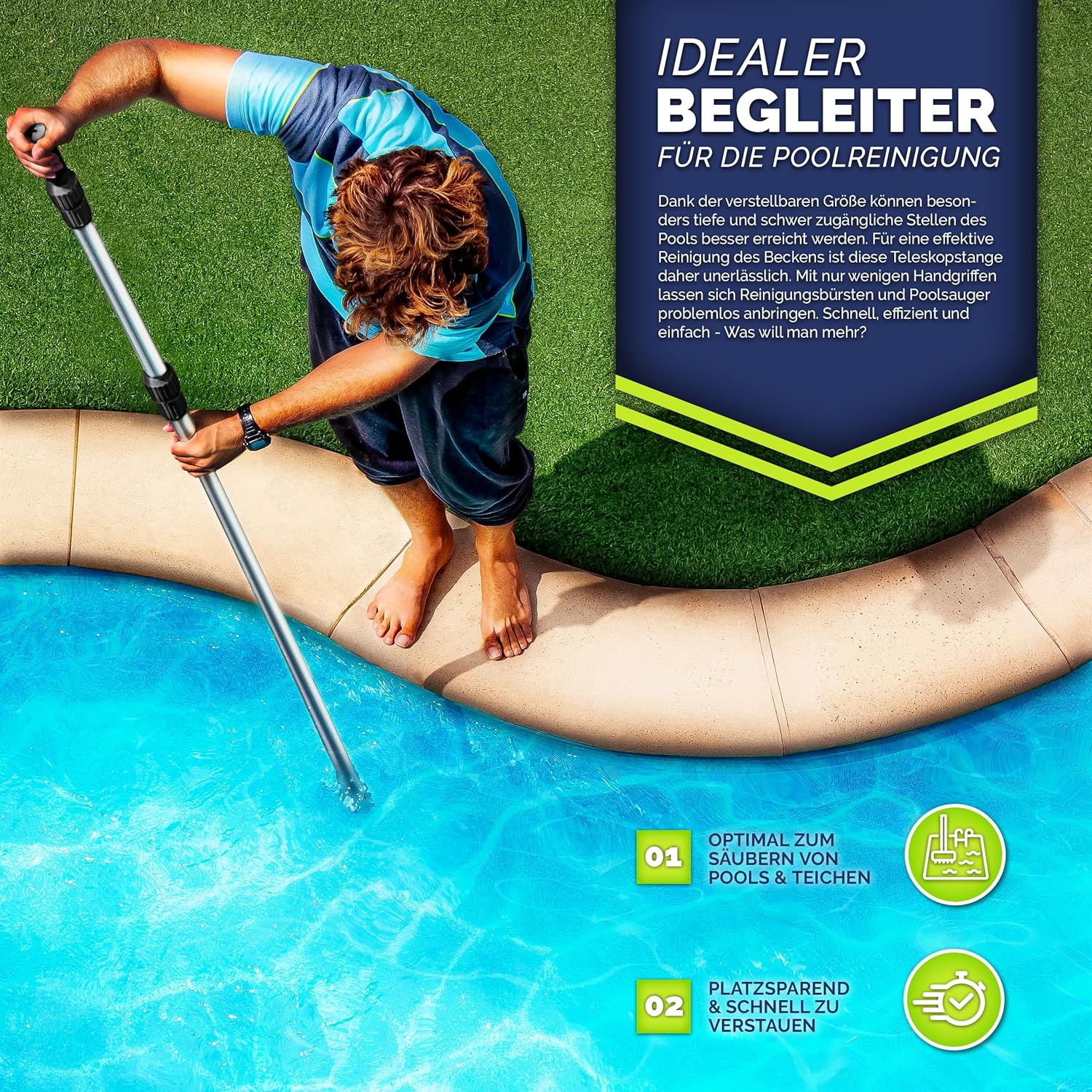 De telescoopstang is bijzonder stabiel en duurzaam. Het gebruikte aluminium is weerbestendig en kan ook bij chloor en zwembadchemicaliën worden gebruikt.