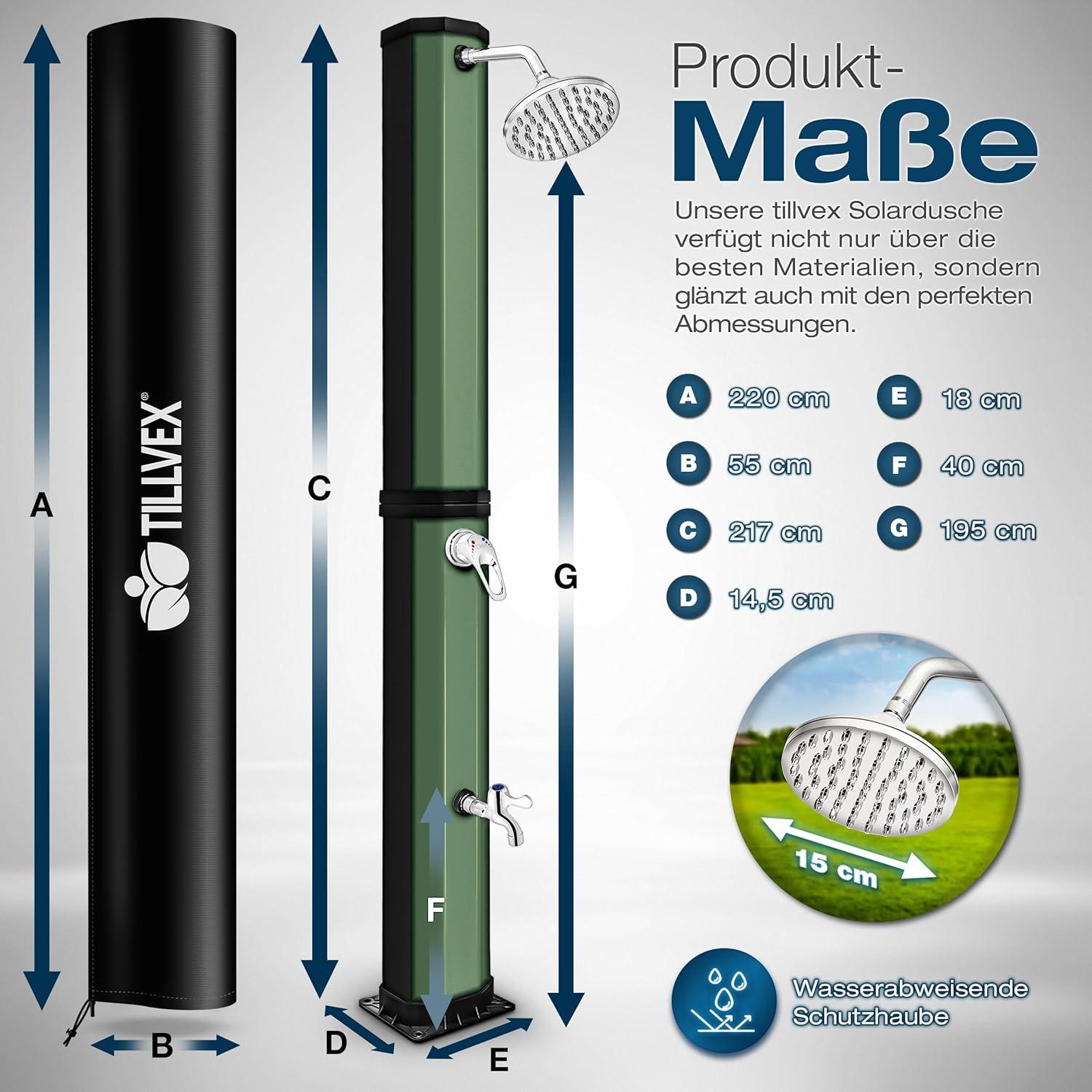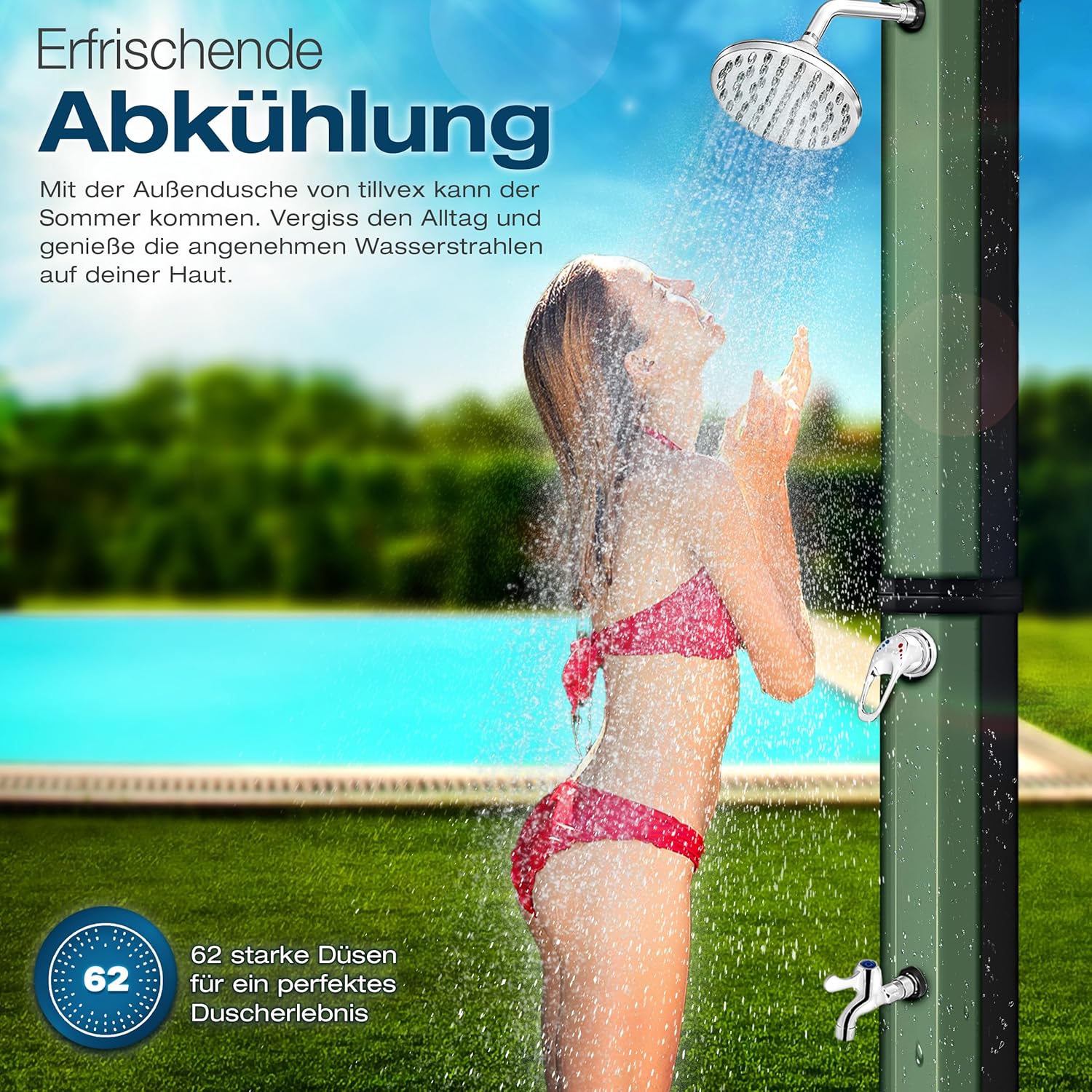 • Premium zonnedouche van Tillvex: zonnedouche van tillvex van uv-bestendig kunststof. Chroomglanzende armaturen en stabiele kunststof voet. Moderne en elegante look. De meegeleverde afdekking beschermt je tuindouche tegen invloeden van buitenaf zoals regen, sneeuw, hagel of externe beschadigingen.