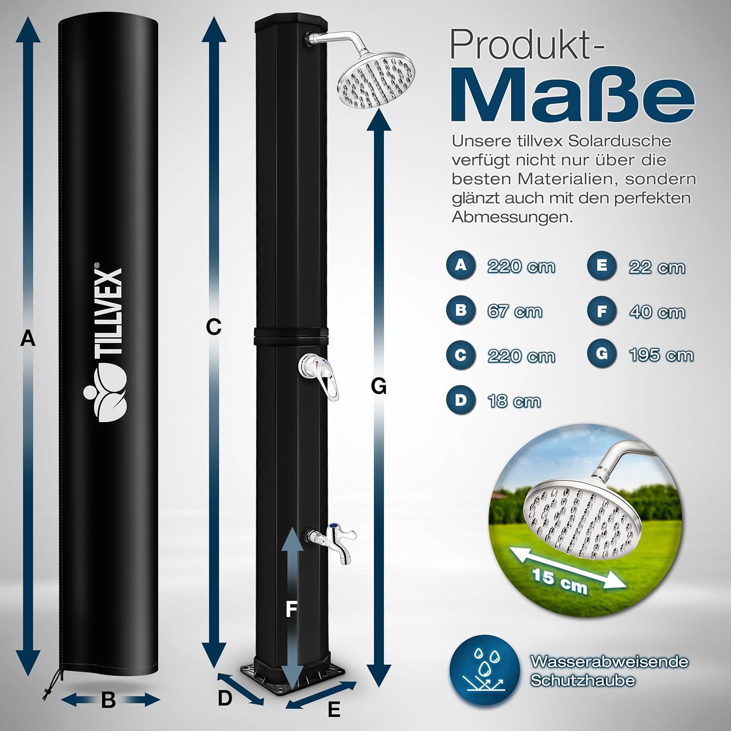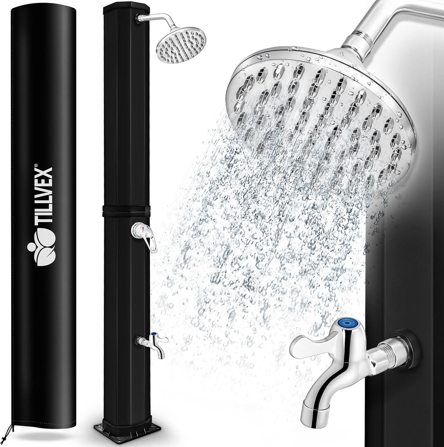 Inclusief beschermkapMateriaal is UV-bestendig Verwarming zonder vreemde energie Robuuste kunststof voet Snel monteren en demonteren door schroefverbinding in de bodem Verstelbare en grote regendouchekop Chroom glanzende armaturen Optimaal voor tuin, camping of aan het zwembad Geschikt voor elke tuinslang Eengreepsmengkraan Universele wateraansluiting