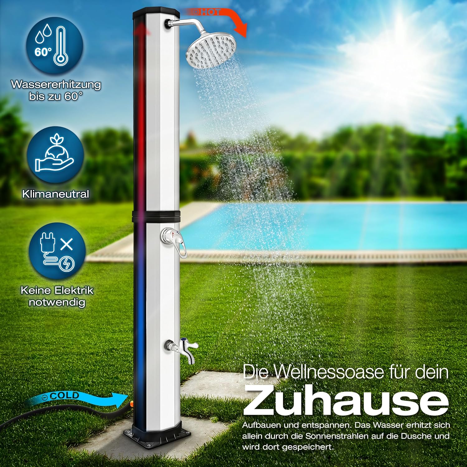 Inclusief beschermkapMateriaal is UV-bestendig Verwarming zonder vreemde energie Robuuste kunststof voet Snel monteren en demonteren door schroefverbinding in de bodem Verstelbare en grote regendouchekop Chroom glanzende armaturen Optimaal voor tuin, camping of aan het zwembad Geschikt voor elke tuinslang Eengreepsmengkraan Universele wateraansluiting