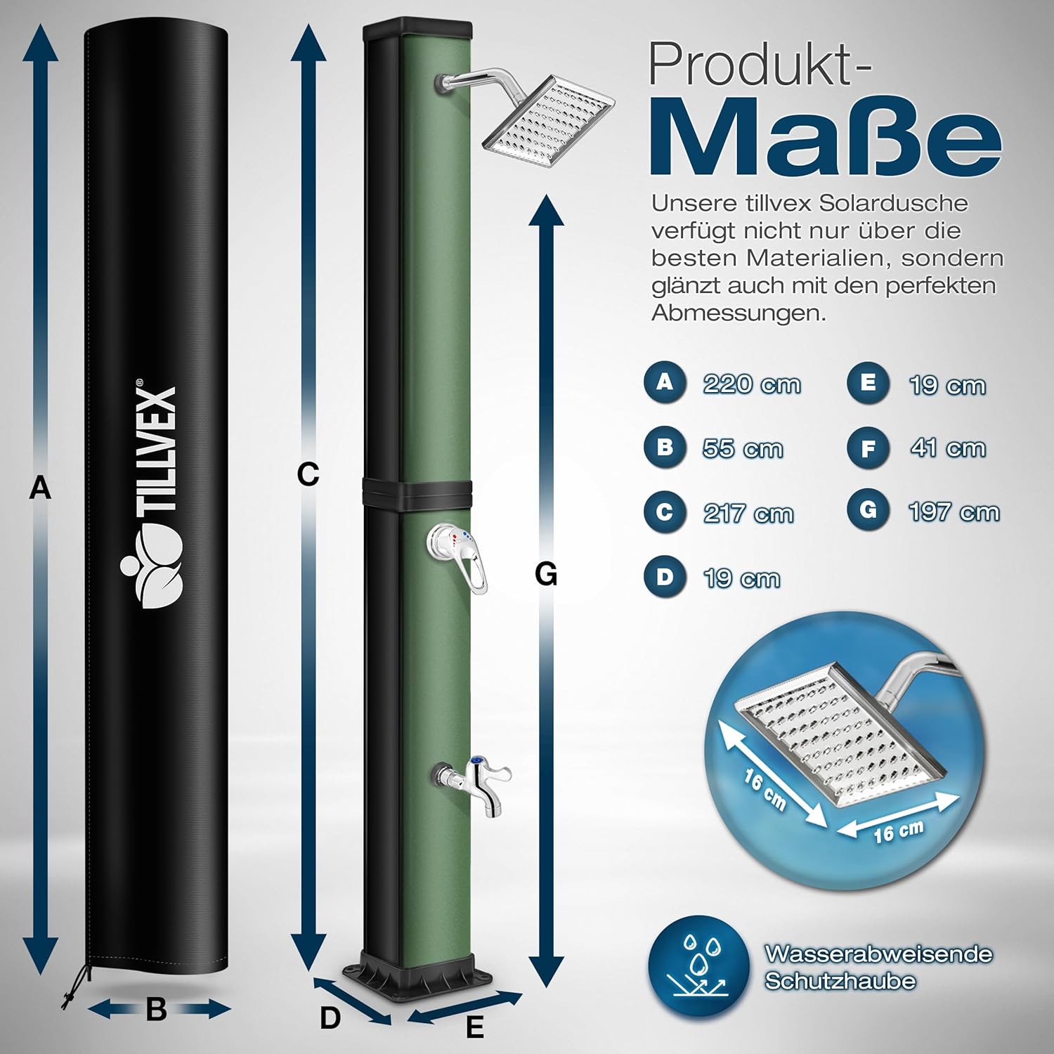 • Premium zonnedouche van Tillvex: zonnedouche van tillvex van uv-bestendig kunststof. Chroomglanzende armaturen en stabiele kunststof voet. Moderne en elegante look. De meegeleverde afdekking beschermt je tuindouche tegen invloeden van buitenaf zoals regen, sneeuw, hagel of externe beschadigingen.