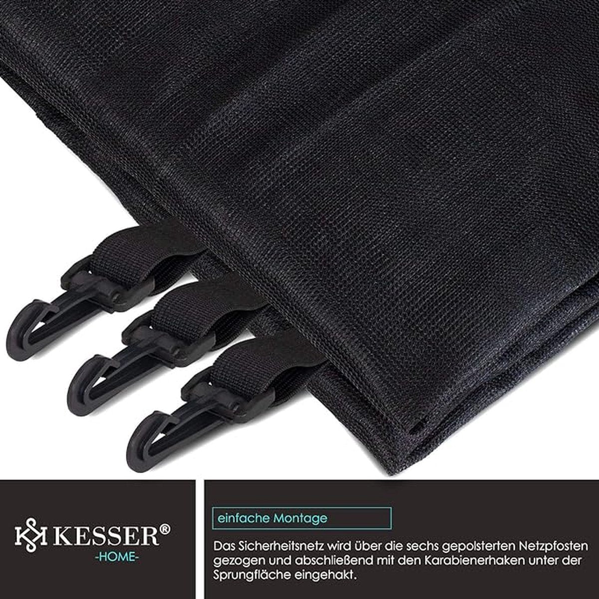 Met de geïntegreerde veiligheidshaken wordt het net eenvoudig aan het trampolineframe bevestigd. De montage is snel en zonder speciaal gereedschap uit te voeren.