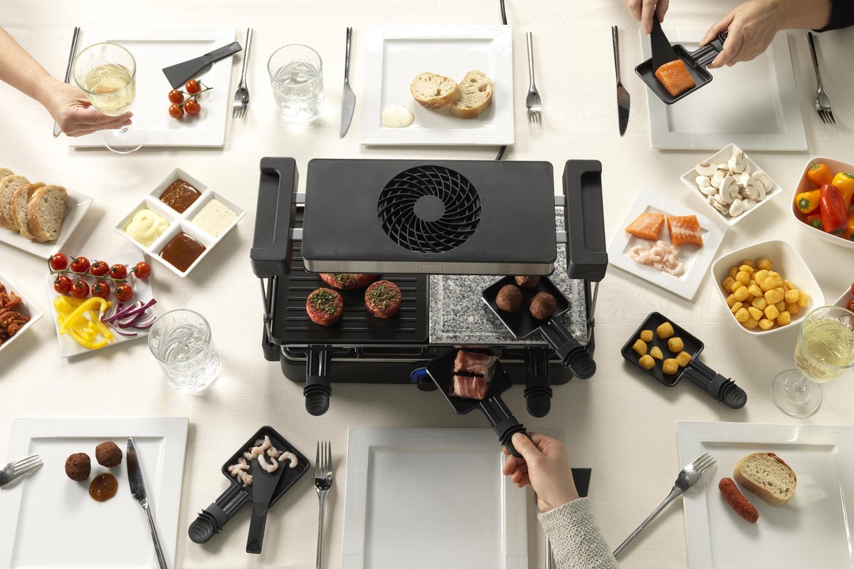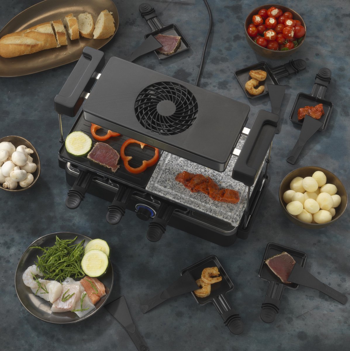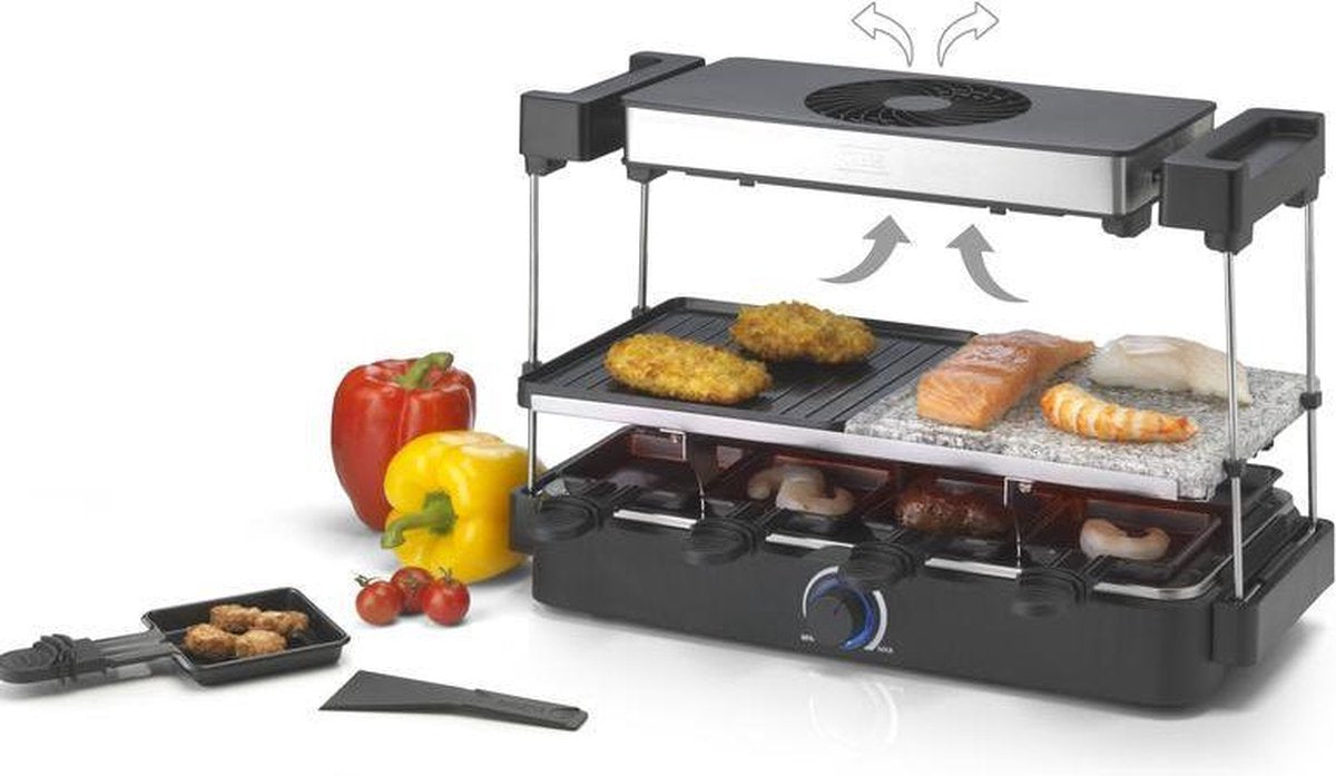 Op de dubbelzijdige grill en teppanyaki combinatieplaat kun je het vlees klaarmaken, terwijl je ondertussen in de gourmet-/raclette pannetjes je groente wokt. Deze 8 pannetjes en beide platen beschikken over een dubbele antiaanbaklaag, zodat je het eten gezond kunt bereiden zonder boter of olie. Daarbij bakt het eten door deze laag niet aan. Om beschadigingen aan de antiaanbaklaag te voorkomen, zijn er 8 kunststof spatels inbegrepen.