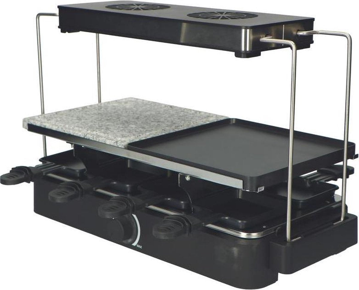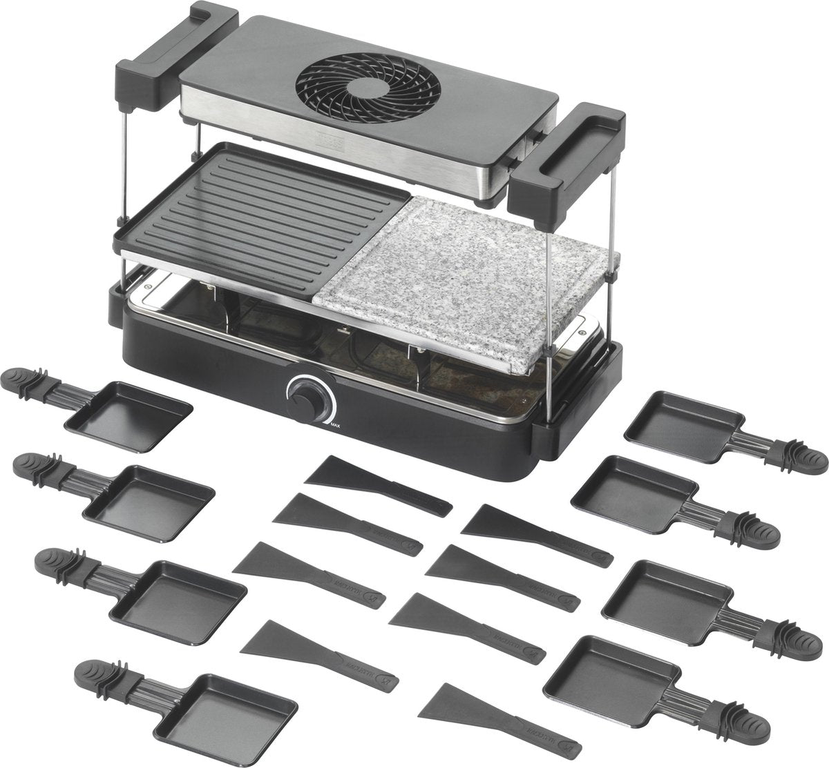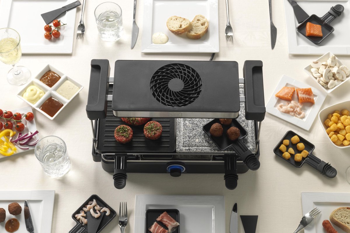 Op de dubbelzijdige grill en teppanyaki combinatieplaat kun je het vlees klaarmaken, terwijl je ondertussen in de gourmet-/raclette pannetjes je groente wokt. Deze 8 pannetjes en beide platen beschikken over een dubbele antiaanbaklaag, zodat je het eten gezond kunt bereiden zonder boter of olie. Daarbij bakt het eten door deze laag niet aan. Om beschadigingen aan de antiaanbaklaag te voorkomen, zijn er 8 kunststof spatels inbegrepen.