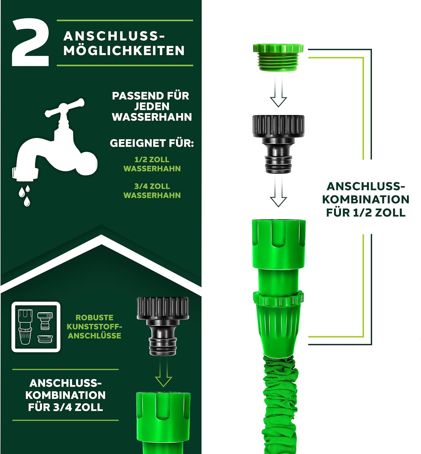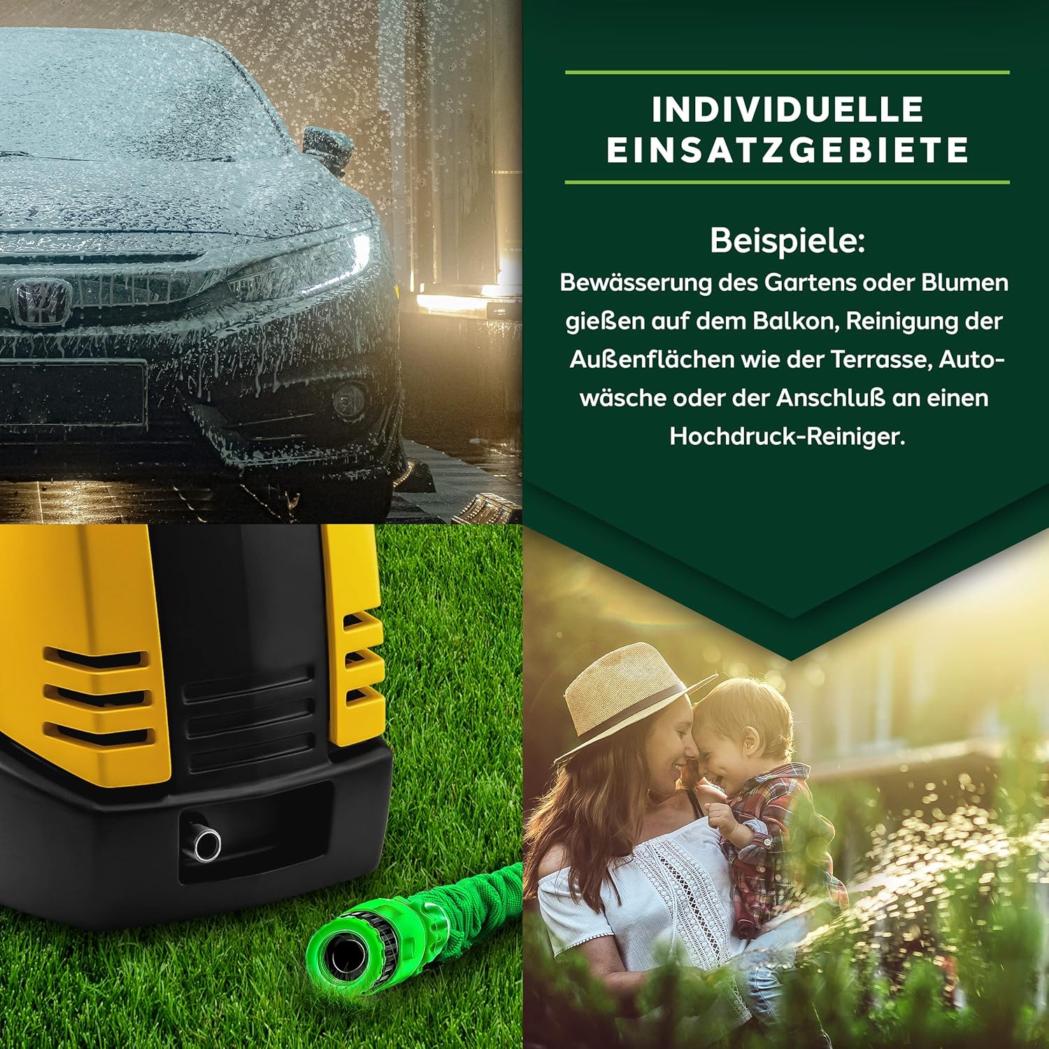 Multifunctionele douche met 7 functies zelfoprolend materiaal, robuuste constructie. Max. Waterdruk: 10 Barwanddikte: 3 mm. Binnendiameter: 14 mm. Binnenmateriaal: Hoogwaardige latex. De slang rekt bij waterdruk tot 3 x eenvoudige aanpassing van de waterdoorloop door verstelbare douche-ein. Zeer laag eigen gewicht/extreme werkvergemakkelijking. Kan worden gebruikt voor irrigatie of voor grotere oppervlaktereiniging, ruimtebesparend opbergsysteem zonder infuus insteeksysteem. Materiaal: latex, kunststof
