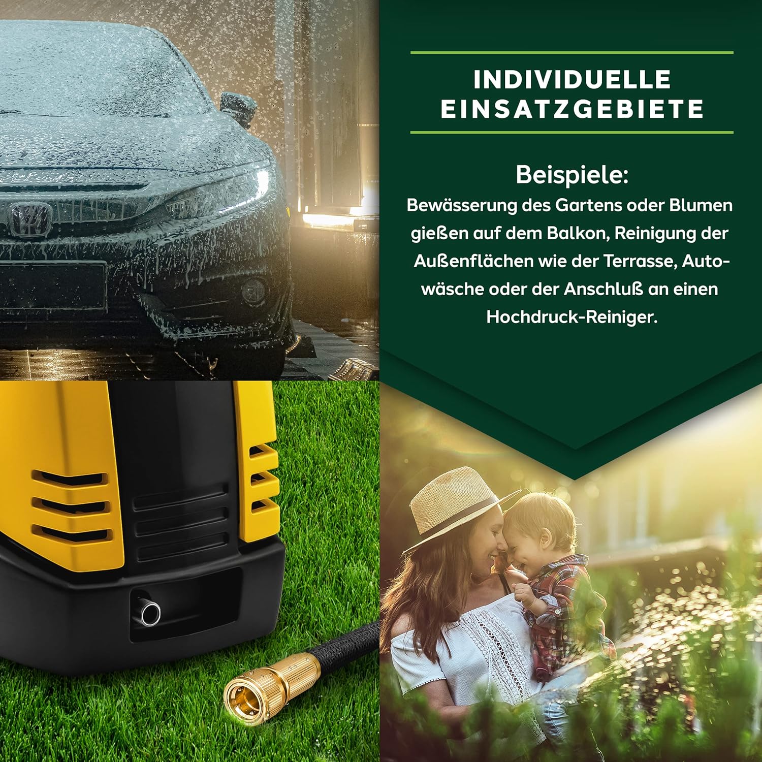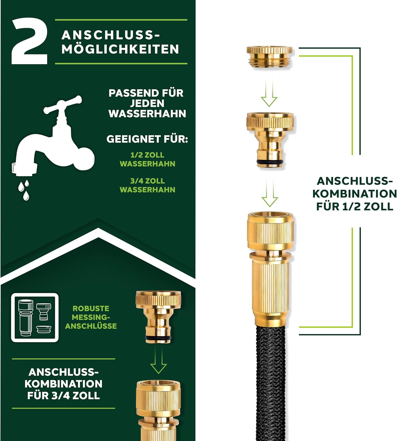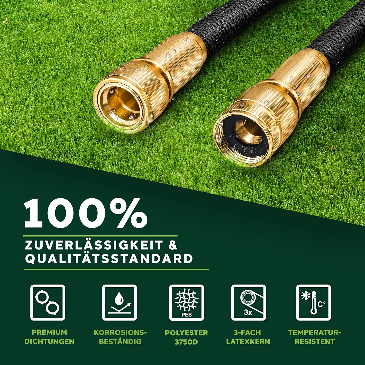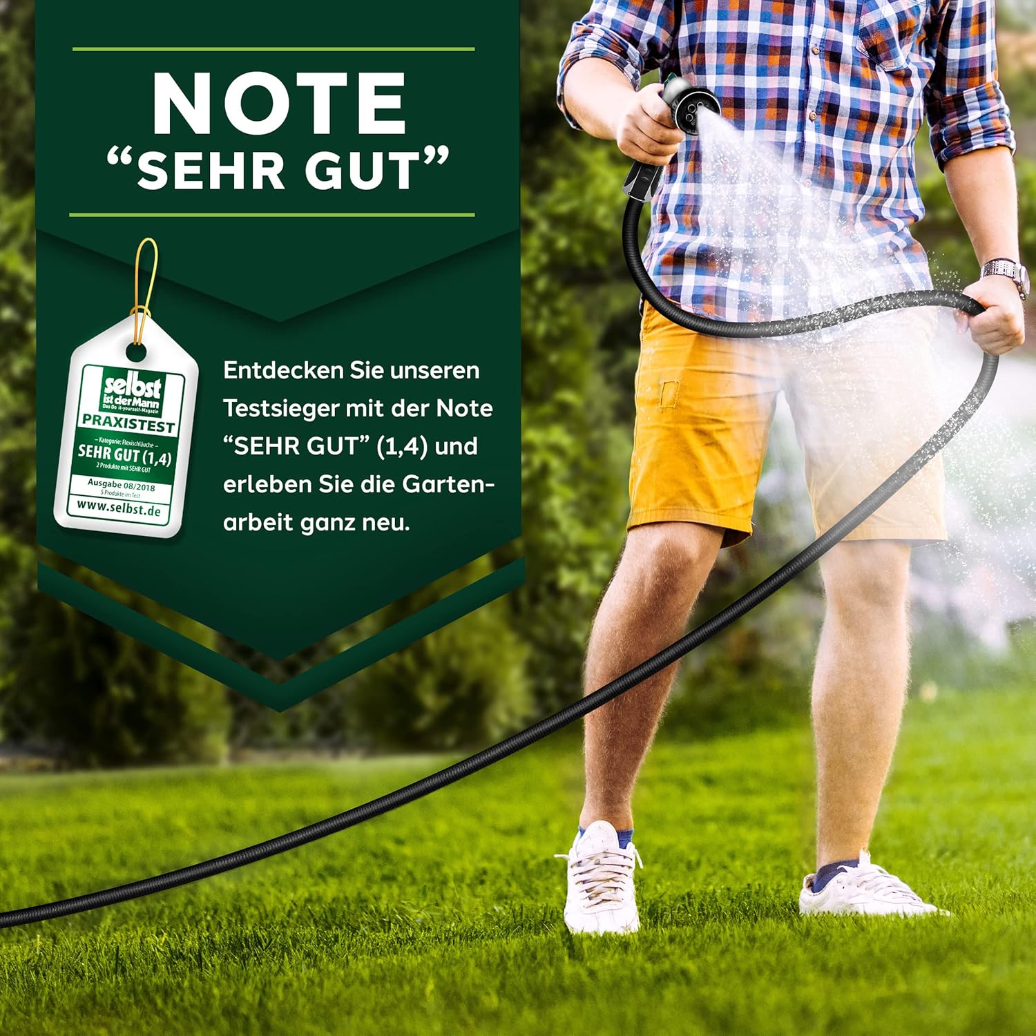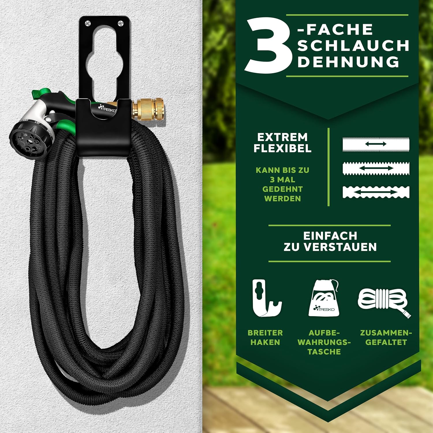 Premium kwaliteit: Zeer flexibele, zich uitstrekkende premium tuinslang van professionele kwaliteit met niet-roestende messing schroefverbindingen en 3-voudige latexkern. De multifunctionele sproeikop met 10 functies (8 sproeiinstellingen, drukregeling min/max, vergrendelfunctie voor sproeiknoppen) beschikt over een ergonomisch geoptimaliseerde handgreep en is bekleed met rubber voor een perfecte grip. De waterdruk kan via een schuifregelaar direct op het pistool worden geregeld en daarom ook voor het besproeien van gevoelige planten worden gebruikt. Kwaliteit: Met sterk, slijtvast kunststof weefsel ommantelde, flexibele waterslang, die zich tot 3 keer de oorspronkelijke lengte kan uitrekken en geschikt is voor een druk tot 10 bar (normaal is 2-8 bar). Adapters voor de aansluiting op de kraan zijn voor de maten 1 inch en ¾ inch al inbegrepen. De beproefde, drukbestendige flexibele slangtechniek is absoluut knikbestendig en de rekbare waterslang dus altijd knikvrij. Opgeruimd: De meegeleverde oproller zorgt voor de nodige orde. De metalen houder wordt daarbij als een ophanging met een haak als wandhouder aangebracht. De wandhouder kan echter ook zonder montagemateriaal aan de kraan worden bevestigd. Vervolgens kan de irrigatieslang erop worden opgerold. De van metaal gemaakte handdouche kan worden opgehangen als hij niet wordt gebruikt. Om het totaalpakket af te ronden, zijn ook twee rubberen reserveafdichtingen inbegrepen. Toepassing: denkbare toepassingsgebieden zijn de – sproeiing van het gazon – de irrigatie van de tuin of – bloemen gieten op het balkon – reiniging van de buitenoppervlakken bijv. het terras – autowas of – de aansluiting op een hogedrukreiniger