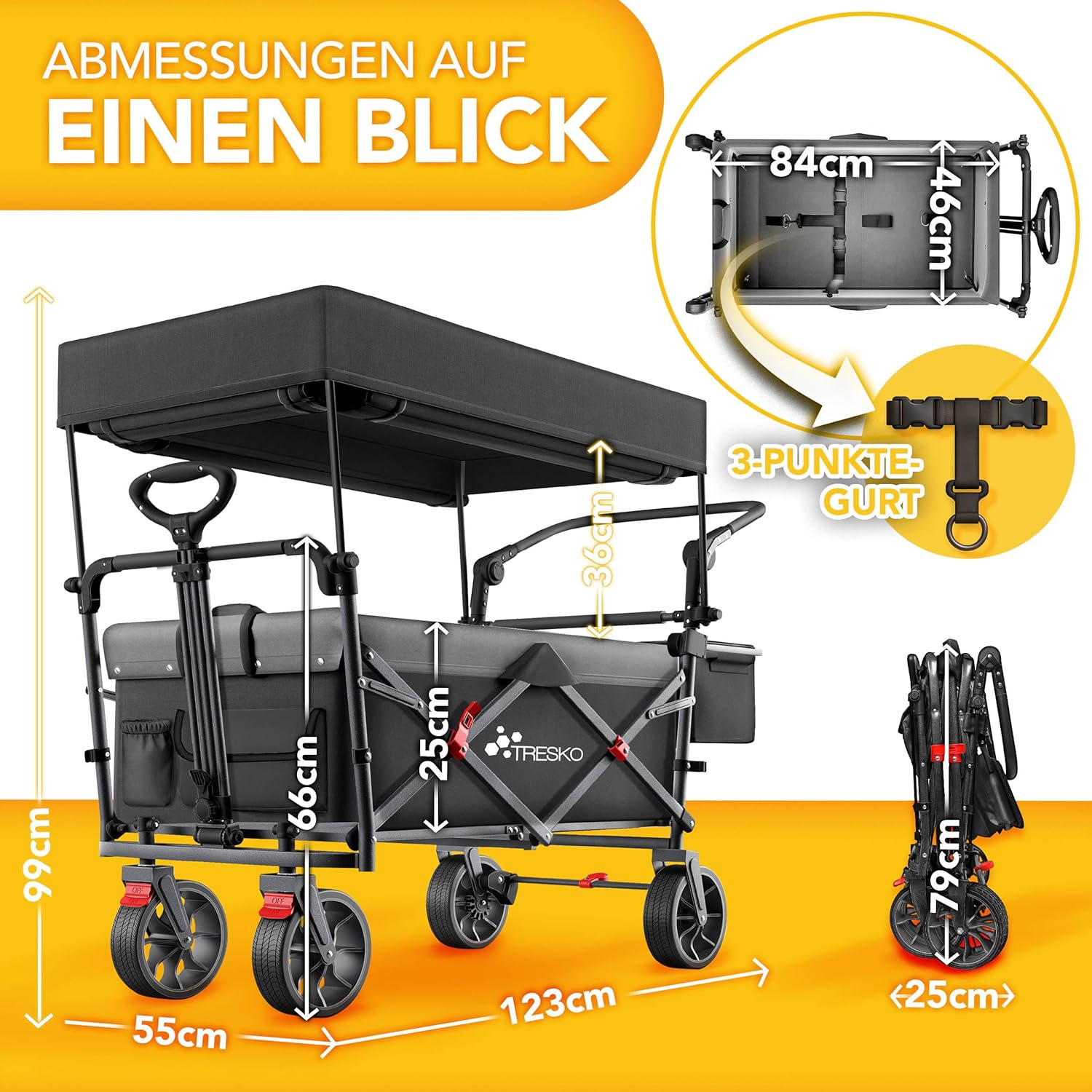 Comfort en veiligheid voor de kleinsten: de TRESKO bolderkar is ook kindvriendelijk ontworpen. Een verstelbare 3-punts gordel zorgt voor de veiligheid van de meerijdende kinderen. De massief rubberen banden met dubbele kogellagers bieden een rustige en rustige rit, zelfs op oneffen ondergrond. De zachte bekleding aan de binnenkant zorgt voor extra rijcomfort.
