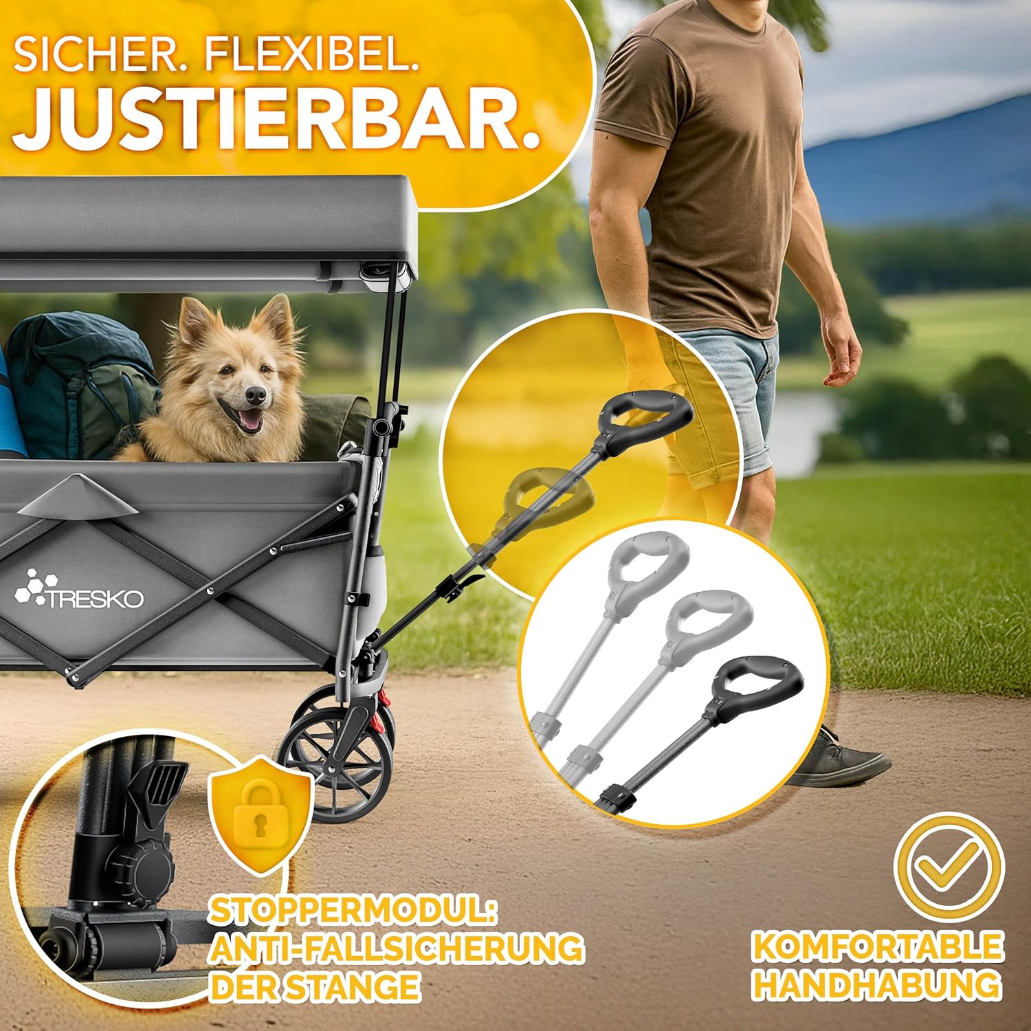 Praktische metgezel voor elk uitstapje: deze TRESKO bolderkar is de ideale handkar en transportwagen voor kamperen, uitstapjes, winkelen, strand of festivals. Met robuust metalen frame en duurzaam, weerbestendig Oxford-weefsel (PU-coat), dat bovendien waterafstotend is, is hij tot 150 kg belastbaar. Het ruime design biedt veel ruimte. Dankzij de soepel lopende 360° draaibare wielen en de betrouwbare remmen kun je de wagen moeiteloos trekken en schuiven en veilig door elk terrein navigeren, of het nu als strandwagen of voor dagelijks transport is.