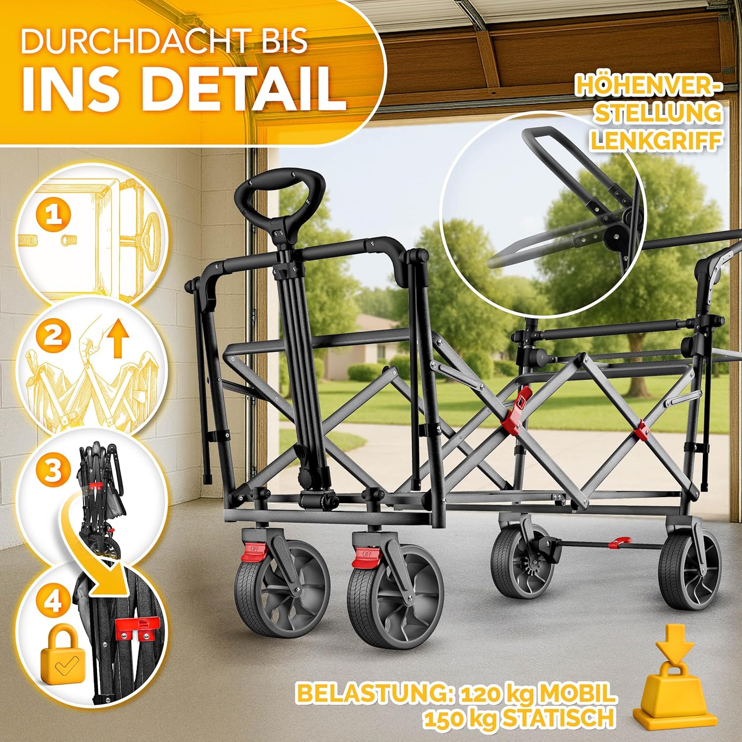 Bliksemsnel opvouwbaar en onderhoudsvriendelijk: de opvouwbare bolderkar XXL kan in een paar eenvoudige stappen compact worden opgevouwen (tot 79 x 55 x 25 cm) en ruimtebesparend worden opgeborgen of vervoerd, ideaal inklapbaar voor onderweg. De overtrek is wasbaar op 30 graden en het vuilafstotende oppervlak zorgt voor eenvoudige reiniging – ideaal voor gebruik buitenshuis. Ervaar maximale flexibiliteit en comfort met deze premium transportwagen.