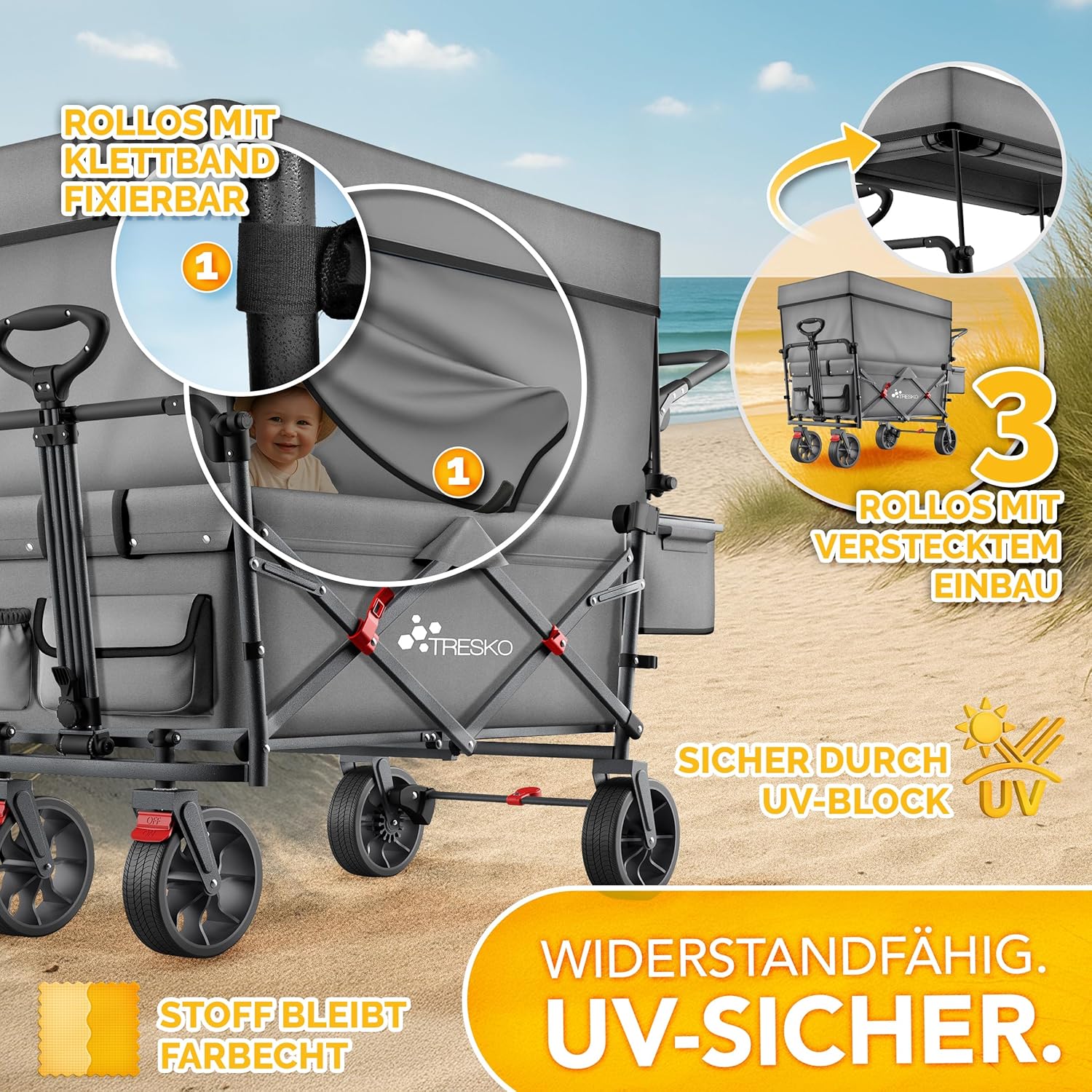 Praktische metgezel voor elk uitstapje: deze TRESKO bolderkar is de ideale handkar en transportwagen voor kamperen, uitstapjes, winkelen, strand of festivals. Met robuust metalen frame en duurzaam, weerbestendig Oxford-weefsel (PU-coat), dat bovendien waterafstotend is, is hij tot 150 kg belastbaar. Het ruime design biedt veel ruimte. Dankzij de soepel lopende 360° draaibare wielen en de betrouwbare remmen kun je de wagen moeiteloos trekken en schuiven en veilig door elk terrein navigeren, of het nu als strandwagen of voor dagelijks transport is.