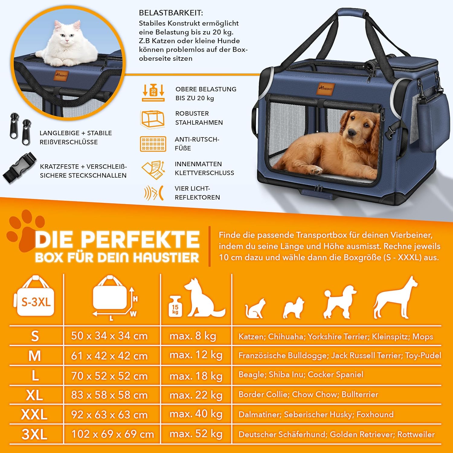 • Ruimtebesparend en eenvoudig op te bergen: onze opvouwbare hondentransportbox biedt een compacte en inklapbare oplossing voor het veilig vervoer van je hond. Hij is ideaal voor onderweg en op reis, en je kunt hem eenvoudig opbergen als je hem niet nodig hebt. Met de draaggreep met zachte voering is de hondentas bovendien vederlicht te dragen. Inbegrepen in de accessoires is een siliconen likmat met zuignappen + 1 spatel voor het verdelen van dierenvoer.