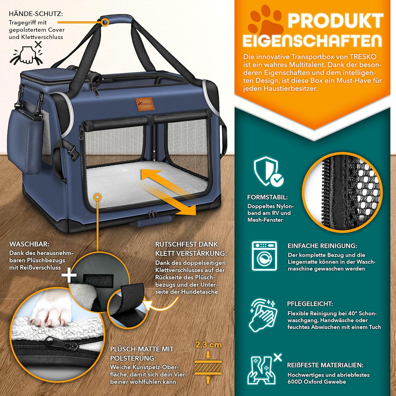 De huisdierdraagtas is opvouwbaar en voor huisdieren is verkrijgbaar in verschillende maten en biedt voldoende ruimte voor kleine, middelgrote en grote honden of katten. Bij de Tresko hondendraagtas is de complete buitenste bekleding afneembaar en kan in de machine worden gewassen. Vlekken of ander vuil kunnen met een vochtige doek of een borstel worden verwijderd.