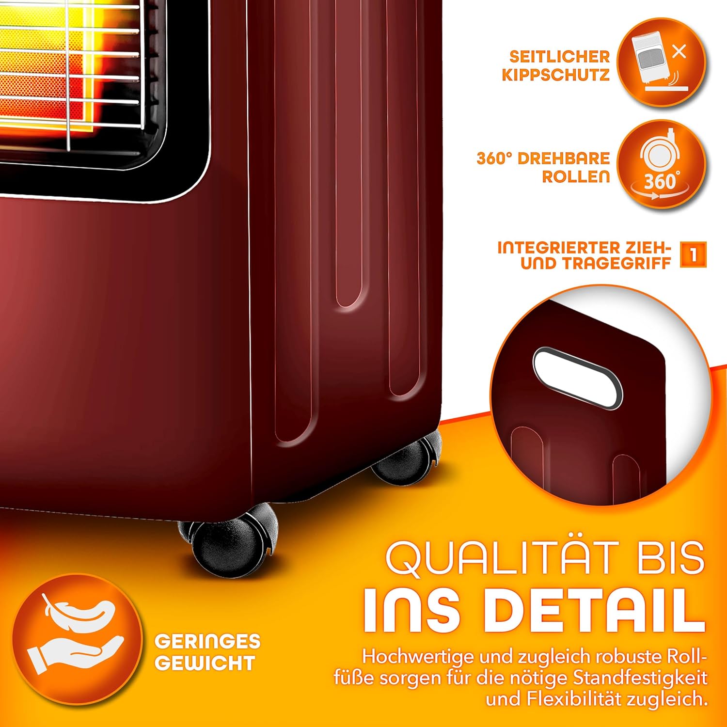 Onze infrarood gasverwarming (afmetingen: 74 x 42 x 35 cm) wordt gekenmerkt door zijn ruimtebesparende constructie en hoge mobiliteit. Het is de ideale oplossing voor balkons, terrassen en goed geventileerde binnenruimtes. Met twee handgrepen en vier wielen is de kachel gemakkelijk te verplaatsen en flexibel inzetbaar.