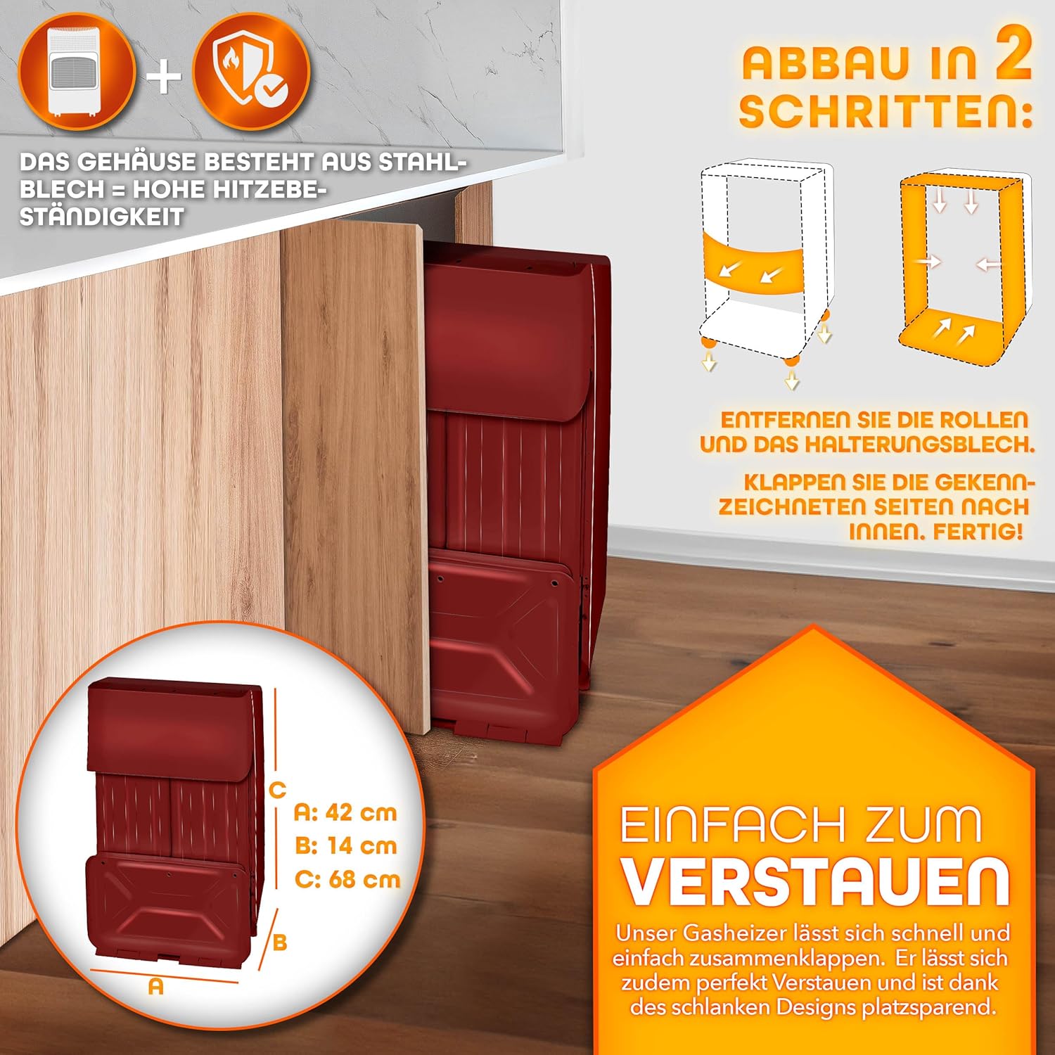 Variabel warmtevermogen in 3 standen instelbaar. Comfortabele piëzo-elektrische ontsteking met een druk op de knop. Grote binnenruimte voor gasflessen tot 15 kg. Bevat standaard slang en drukregelaar. Gemakkelijk te verplaatsen dankzij 4 draaibare 360° zwenkwielen. Stabiele en veilige stalen behuizing voor betrouwbare bescherming. Ruimtebesparend met inklapbaar design. Extra veiligheid door beschermingsrooster en ontstekingsbeveiliging; zuurstoftekort. GebruikIndruk. Vermogen tot 4200 W; geschikt voor binnen en buiten voor veelzijdige toepassingen; geschikt voor gasflessen met een capaciteit van 15 kg; inclusief 50 mbar drukregelaar en slangenEfficiënt luchtverbruik: 100 g/h (min), 200 g/h (medium), 300 g/h (max). Compatibel met LPG-, butaan- of propaan-vloeistofcilinders. Voorkomt oververhitting en kantelen aan de zijkant voor veilig gebruik