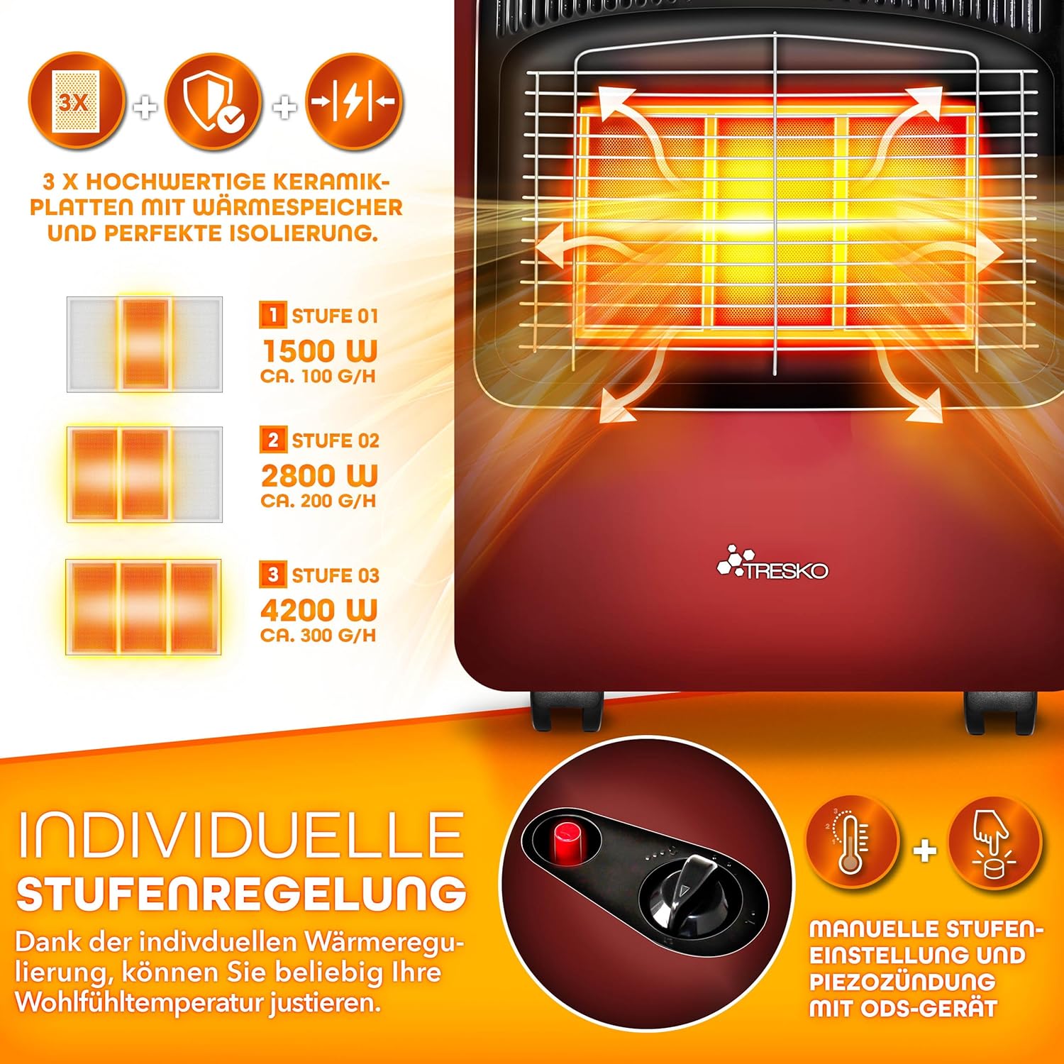 Tresko 4200 watt gaskachel inclusief Gasdrukregelaar, gasslang + afdekking, keramische gaskachel, met 3 standen, infrarood gaskachel, warmtestraler voor butaan of propaangasflessen tot 15 kg