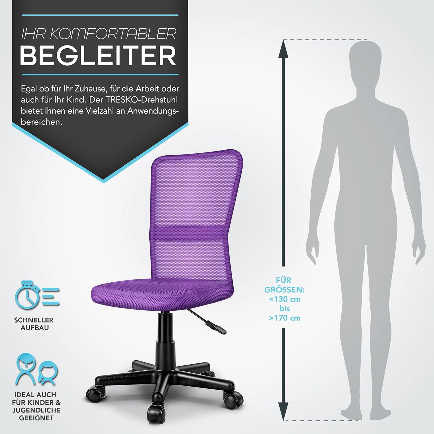 De zitting is 44 cm diep en 42,5 cm breed. Het 48 cm in diameter meetbare voetdraaikruis is uitgerust met 5 kunststof lichtlopende wielen. De hoogte van de rugleuning bedraagt 59 cm.