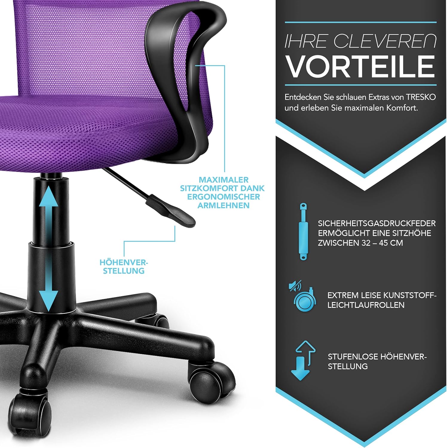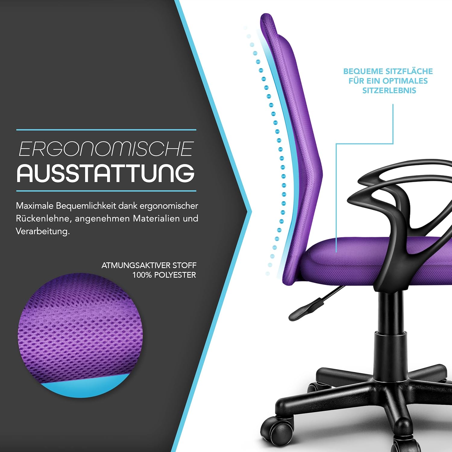 Bijzonder ademend zitvlak en rugleuning, twee armleuningen, traploze zithoogteverstelling, veiligheidsgasdrukveer, 5-ster-voetdraaisluiting, lendensteunen, kunststoflichtlopende wielen