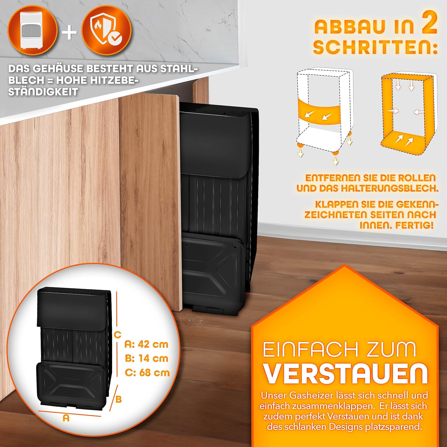 De stalen behuizing van deze gaskachel garandeert niet alleen robuustheid, maar beschermt ook de gasfles veilig met een spatbord. Veiligheidsfuncties zoals een atmosferenbewaker, thermokoppel en kantelbeveiliging zorgen voor je veiligheid en minimaliseren het risico op brandwonden bij deze radiator. Zo kun je rustig verwarmen zonder je zorgen te hoeven maken over je veiligheid.