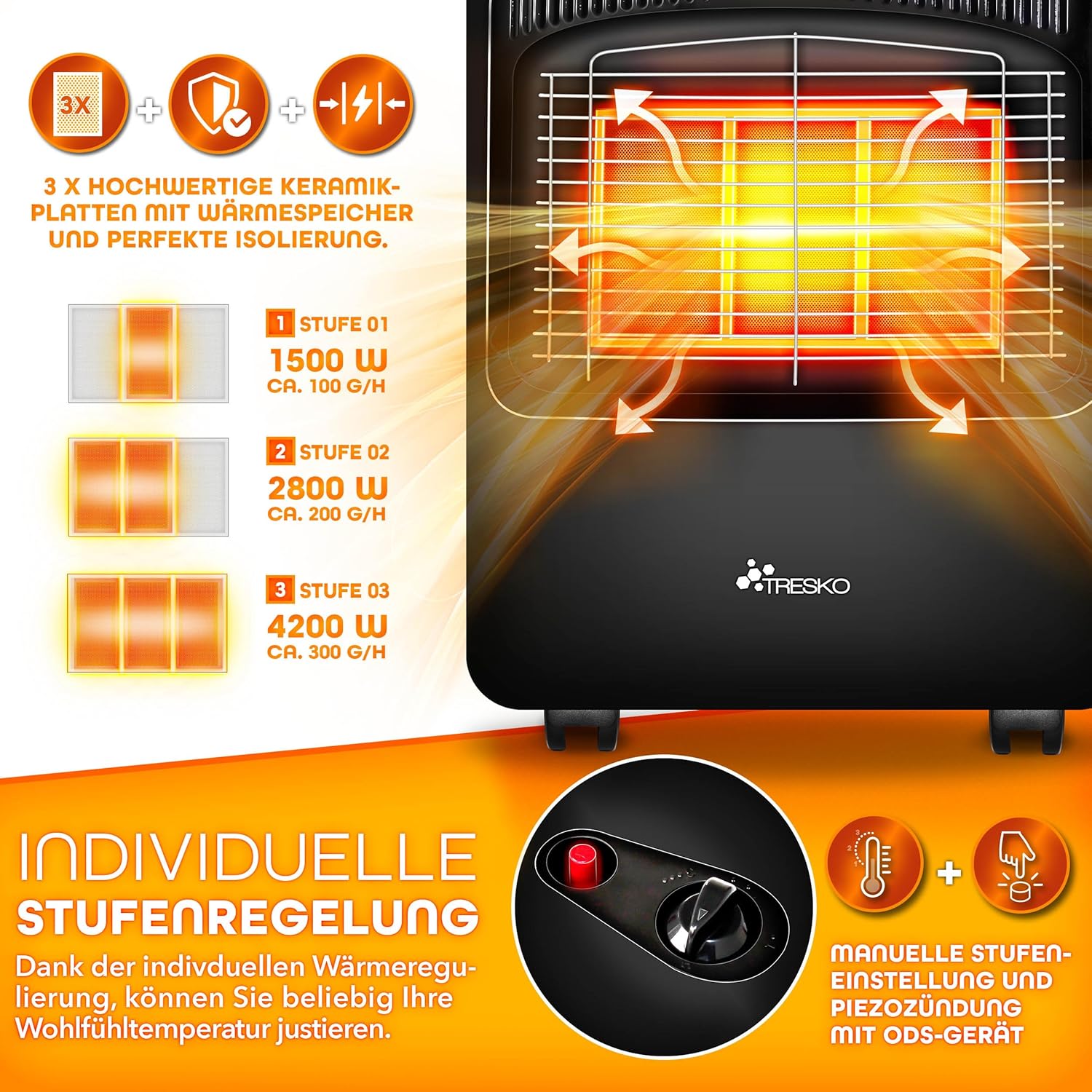 TRESKO4200 watt gaskachel inclusief Gasdrukregelaar, gasslang + afdekking, keramische gaskachel, met 3 standen, infrarood gaskachel, warmtestraler voor butaan of propaangasflessen tot 15 kg