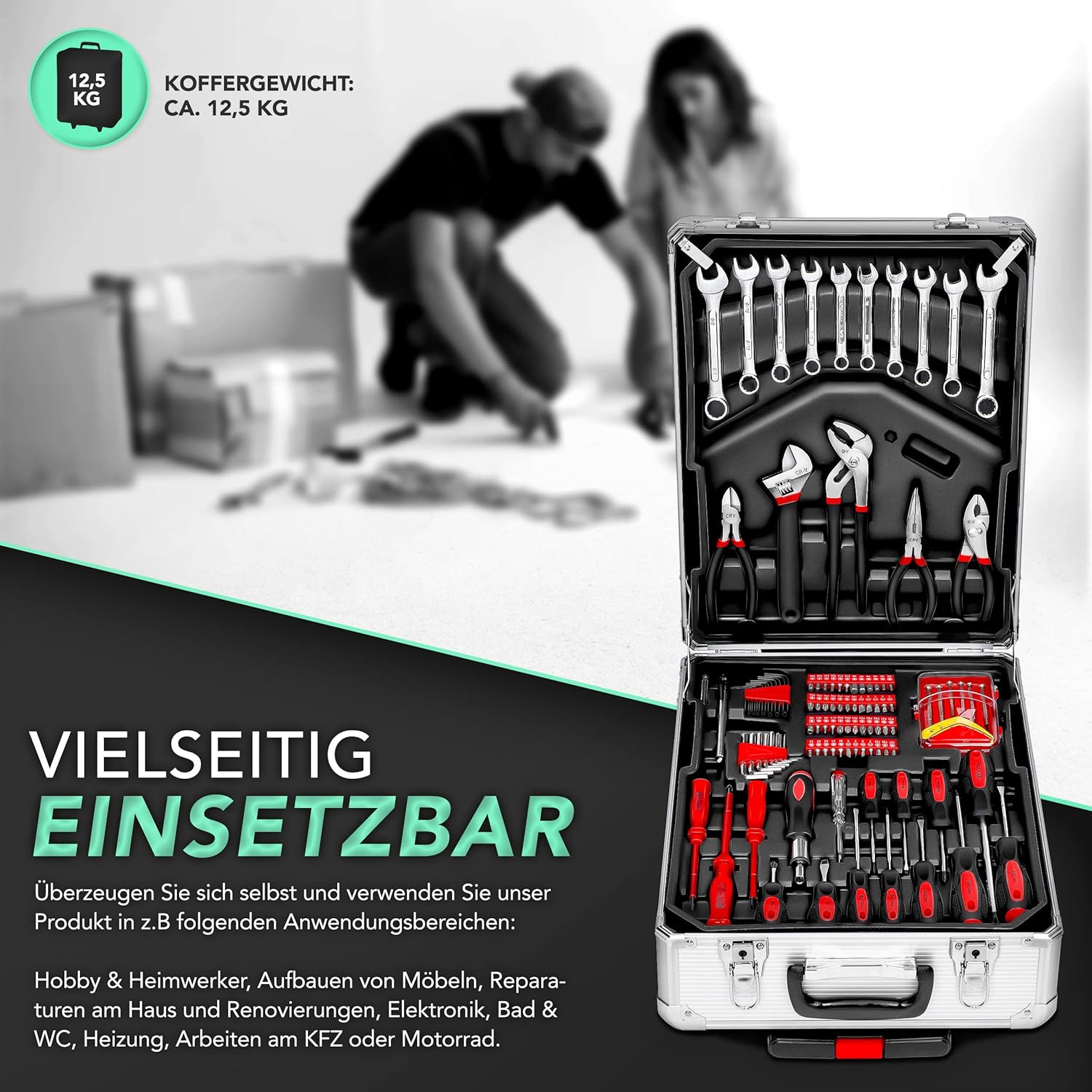 11 x schroevendraaier (sleuf: 6 x 100, 5 x 75, 3 x 75, 4 x 100, 6 x 38 mm. Kruis: PH3 x 150, PH2 x 100, PH1 x 75, PH0 x 75, PH2 x 38 mm) 3 x geïsoleerde schroefendr. tot 1000 V (B0,8 x 4 x 100, B1,0 x 5,5 x 125, PH0 x 100), 1 x ratelschroevendraaier. Geschikt voor bitset, 6 precisieschroevendraaiers (sleuf: 1,0 | 1,2 | 1,8 | 2,4 mm | Kruis: 3,0 | 3,5 mm) 48 x bit (sleuf, kruis, vierkant, binnenzeskant, zeskant, zeskant, dopsleuteladapter, belangrijke maten meervoudig inbegrepen), 16 x inbussleutel (1,5 | 2,0 | 2,5 | 3,0 | 4,0 | 5,5 | 6 mm) 1 x magnetische bithouder voor accuschroevendraaier1 x x Bandenspanningstest. apparaat 1 x fasetester (100-500 V)