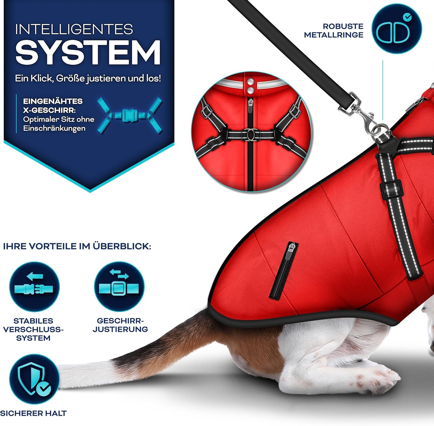 Hondenvest voor kleine en grote honden; ingenaaid X-harnas inclusief Metalen ring Met reflectoren aan de jas en het harnas, inclusief 15 poepzakken en dispensers. Geen klemmen door de achterkant op de ritssluiting, zijdelings ingenaaide zak voor dispenser, hondensnoepjes of speelgoed, individuele kraaginstelling; drukknopen op de kraag; wasmachinebestendig op 30 graden water- en sneeuwafstotend oppervlak, winddicht designDuurzaam en soepel materiaal; 3-laags materiaal; polyester, katoen en polaire fleece. Opslaan en ademend Eigenschappen: