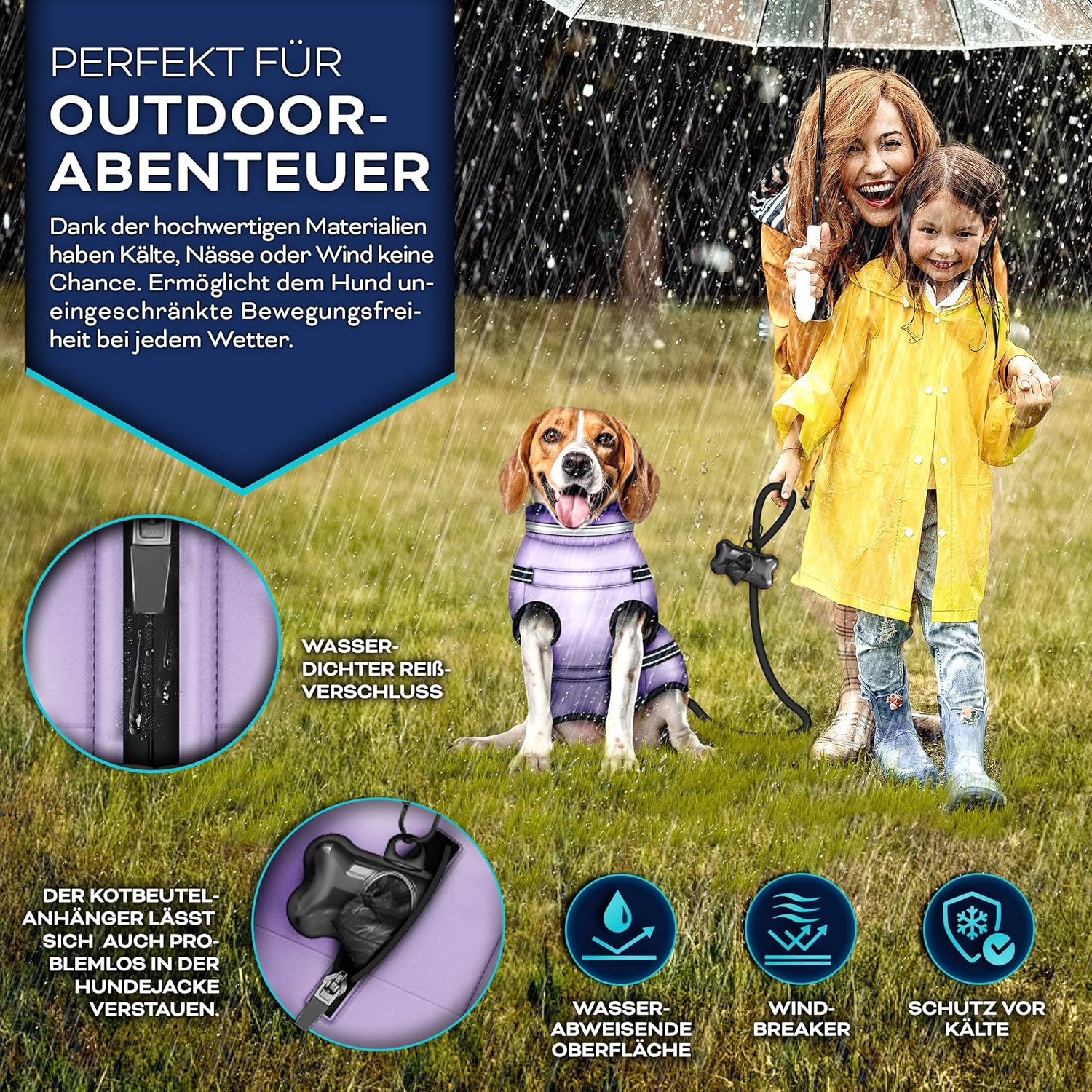 Daarnaast zijn 15 poepzakjes inclusief Dispenser. De dispenser kan in het meegeleverde zijvak worden bewaard. Dankzij het geïntegreerde harnas is het aan- en uittrekken van de hondenregenjas kinderspel. Geen moeizaam hanteren meer met aparte tuigjes en jassen. Het praktische ontwerp maakt een snelle en ongecompliceerde aanpassing mogelijk, terwijl je hond comfortabel in zijn jas blijft.