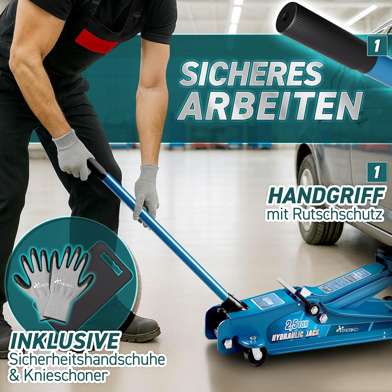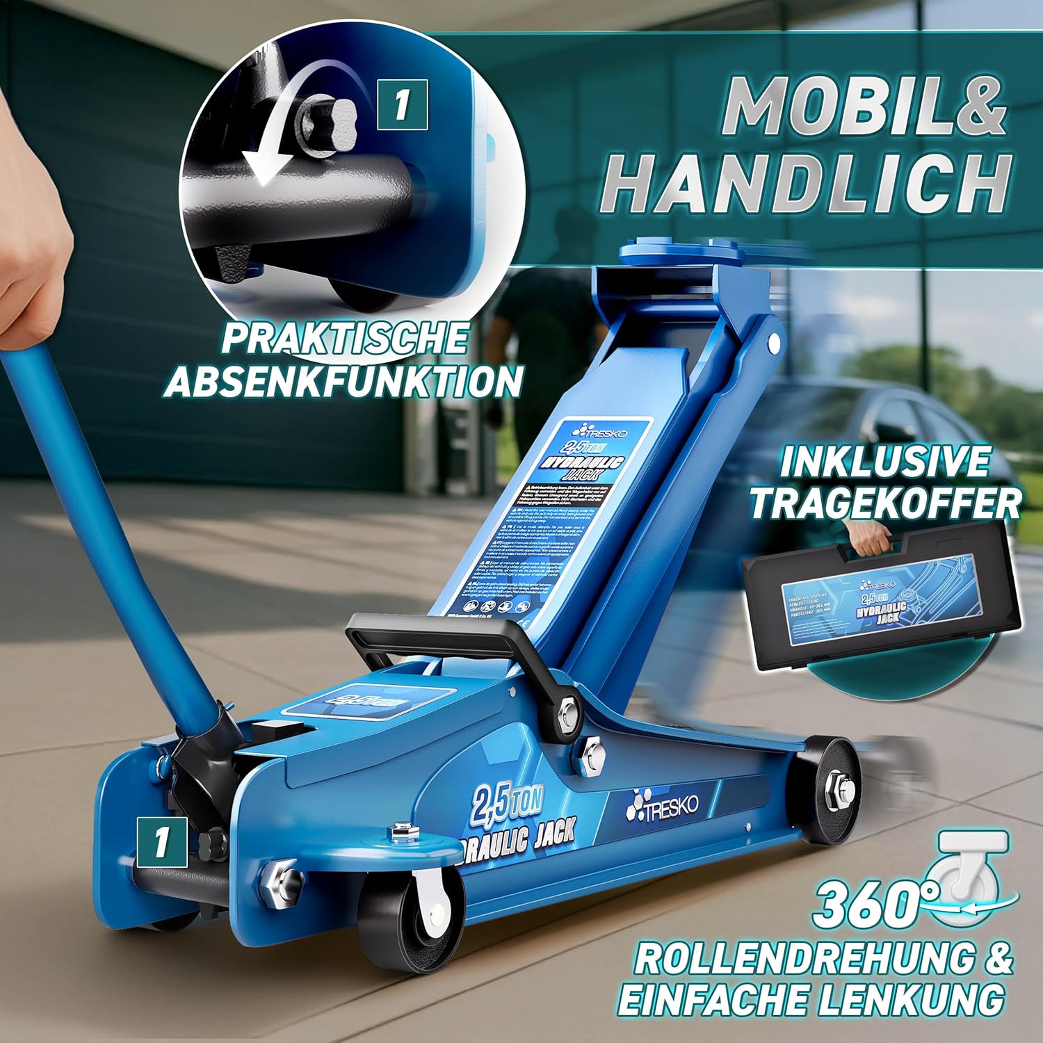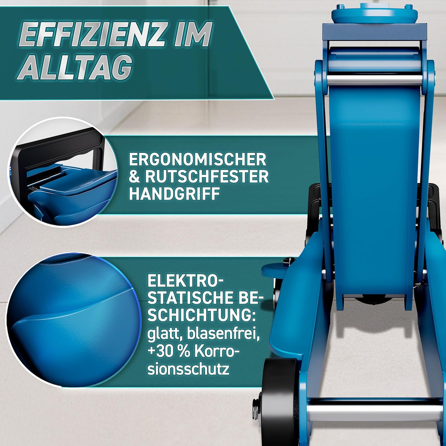 Robuust, mobiel en premium kwaliteit: de hydraulische krik overtuigt door zijn krasbestendige coating, een massieve basis ter bescherming tegen vervorming en 360° wielen voor gemakkelijk manoeuvreren. Dankzij de zachte stangcoating wordt het gebruik nog comfortabeler. Een onmisbaar gereedschap voor garage, werkplaats en onderweg.