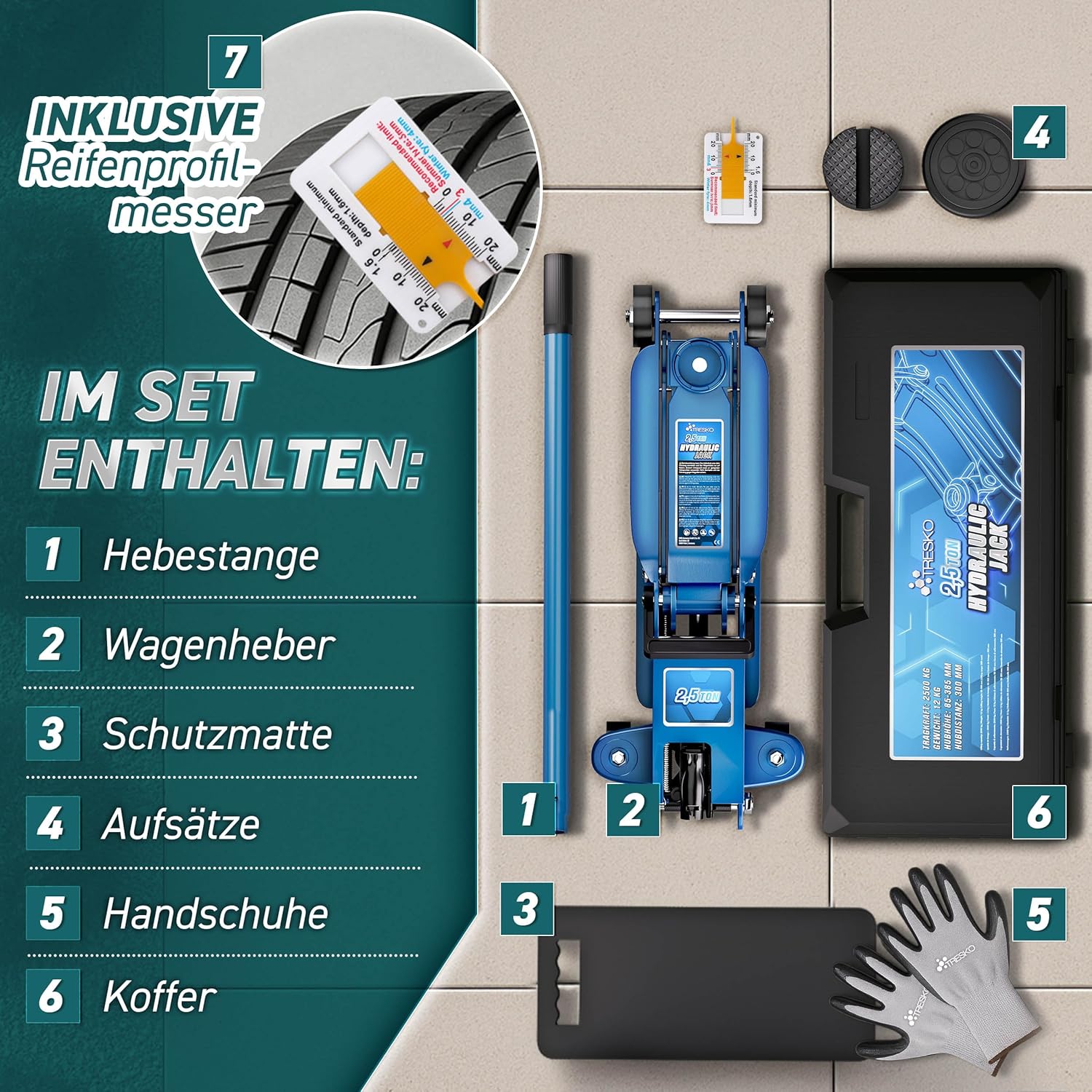 Inclusief accessoires en bescherming: bij deze krik wordt geleverd met een transportkoffer, 2 x rubberen pad (voor oudere voertuigen met vouw en voor voertuigen zonder hefpunt/met vouw), een robuuste anti-slip hefstang, een kniebeschermer voor werken met knieën en gripvaste werkhandschoenen. Daarnaast ontvang je een bandenprofielmeter om de profieldiepte van je banden altijd veilig te kunnen controleren.
