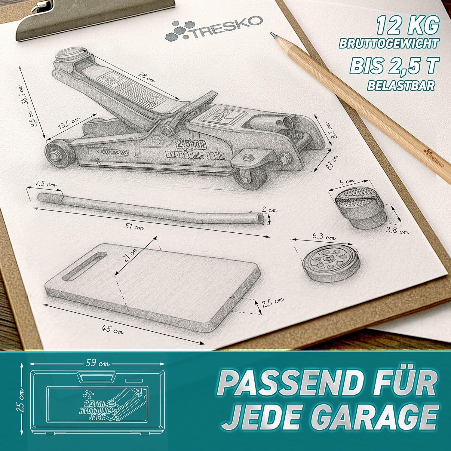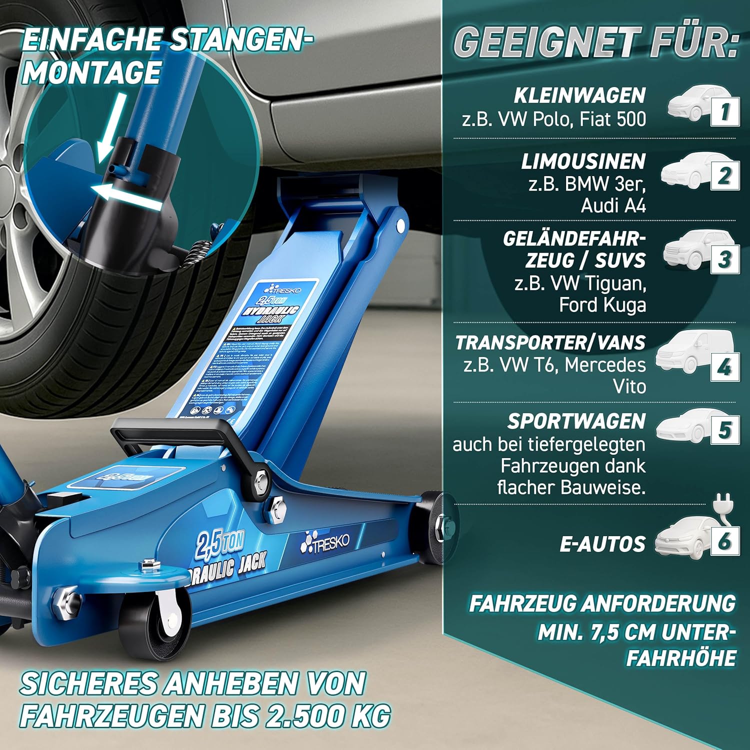 Sterke draagkracht tot 2,5 T: met de hydraulische krik til je voertuigen tot 2500 kg veilig en betrouwbaar op. De premium autojack van gepoedercoat staal is universeel inzetbaar voor kleine auto's, sedans, SUV's, bestelwagens, sportwagens en ook voor e-auto's – zelfs verlaagde voertuigen kunnen dankzij de platte constructie probleemloos worden opgetild.