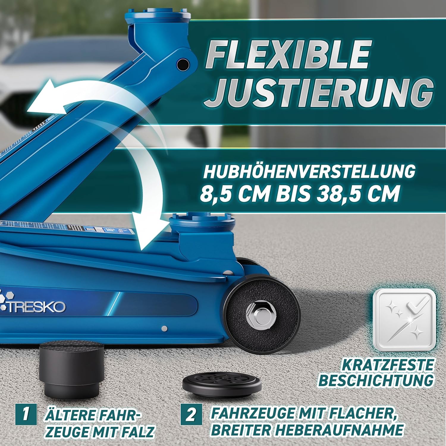 Flexibele hefhoogte 85-385 mm: de hydraulische garagekrik biedt een extra brede hefhoogteverstelling van slechts 8,5 cm tot 38,5 cm. Daardoor is hij geschikt voor zowel voertuigen met een lage bodemvrijheid als voor hogere carrosserieën. Perfect voor gebruik in de garage en werkplaats.
