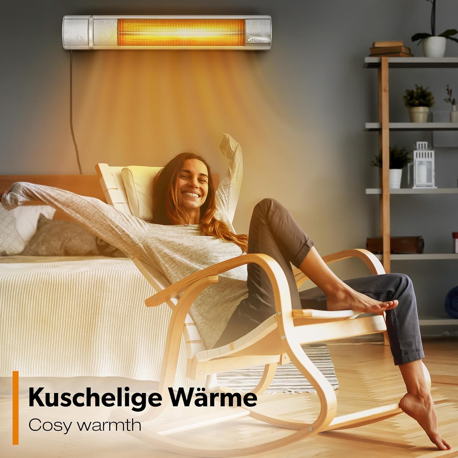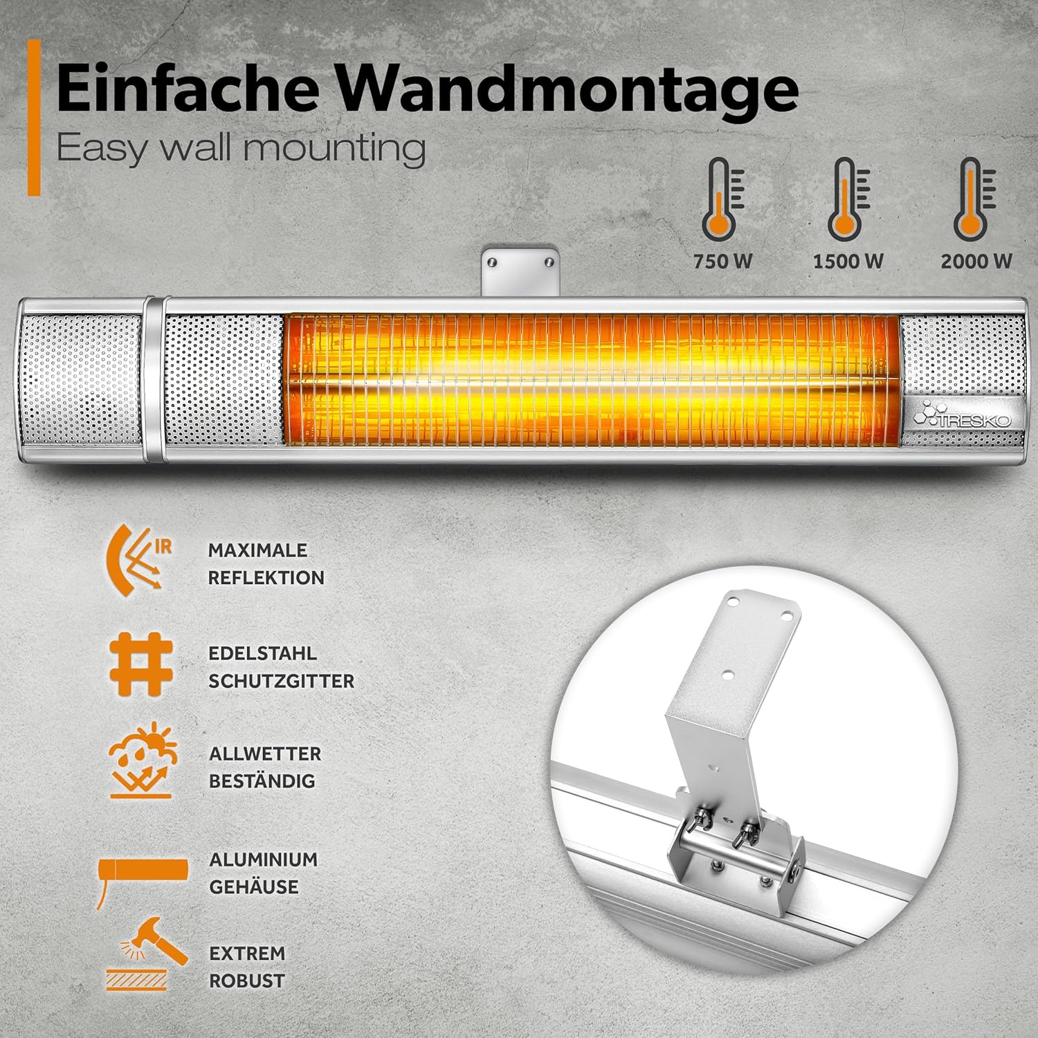 Warmtestraler verwarmt binnen enkele seconden, 3 vermogensniveaus 750, 1500, 2000 W, met afstandsbediening, inclusief wandhouder en montagetoebehoren, kwartsverwarmingselement, aan-/uitschakelaar roestvrij stalen beschermrooster, aluminium spuitgegoten behuizing, geschikt voor binnen en buiten