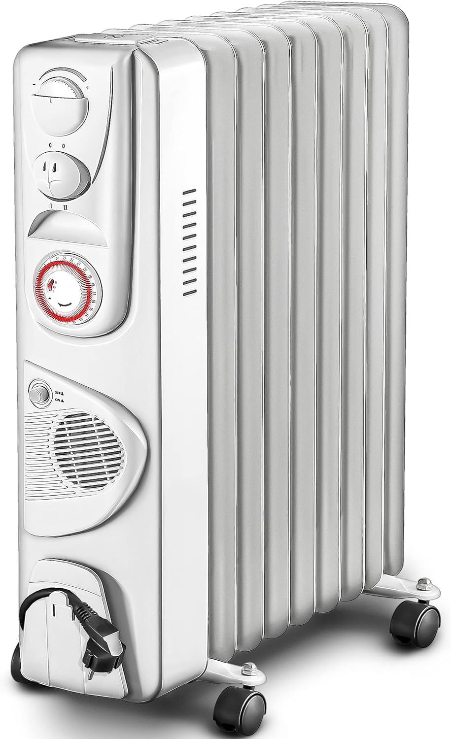 9 - 11 verwarmingselementen, 3 bestaande verwarmingsstanden, oververhittingsbeveiliging, 24 uurs timer, geïntegreerde timer, zeer energiebesparend door kort opwarmen, gebruik binnenshuis, 4 wielen, traploze temperatuurregeling, aan/uit-schakelaar met controlelampje, geïntegreerde kabelopwikkeling. Warmte-instelling door thermostaat. Voeding: Netstroomspanning: 220-240 V/50/60 Hz